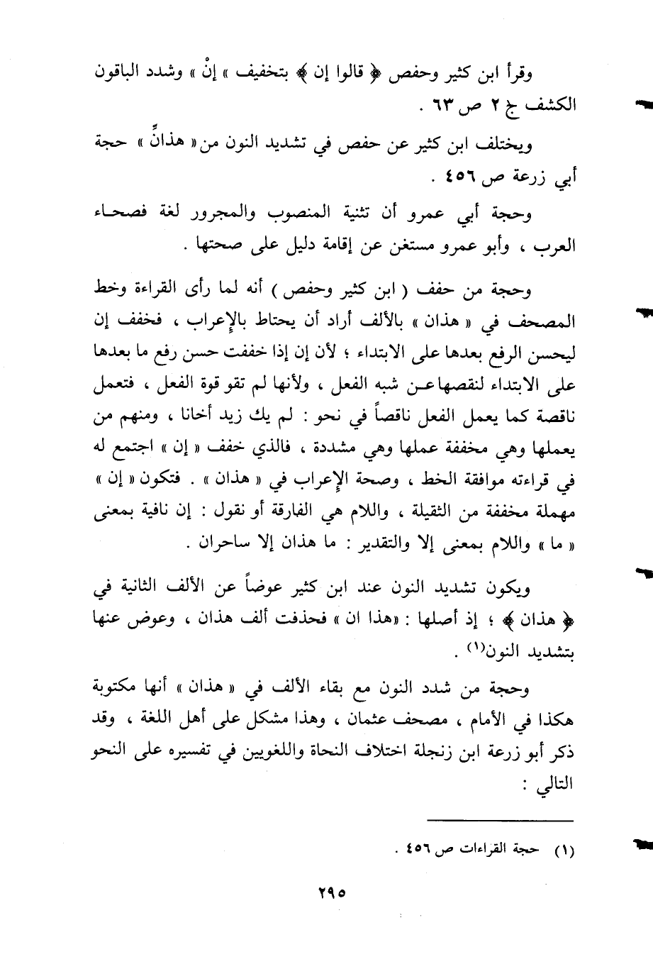 وحجة من شدد النون مع بقاء الألف في "هذان" أنها مكتوبة هكذا في الإمام، مصحف عثمان، وهذا مشكل على أهل اللغة، وقد ذكر أبو زرعة ابن زنجلة اختلاف النحاة واللغويين في تفسيره على النحو التالي: