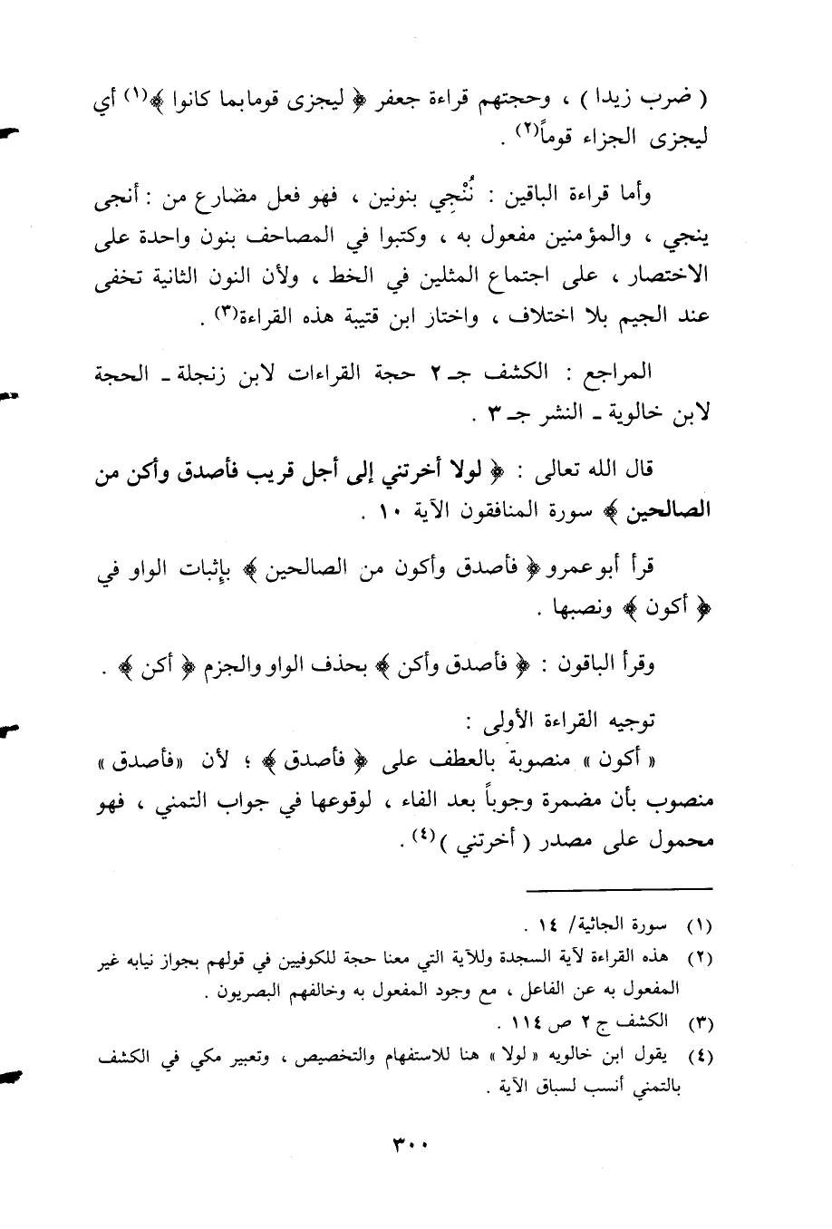وأما قراءة الباقين: ننجي بنونين، فهو فعل مضارع من: أنجى ينجي، والمؤمنين مفعول به، وكتبوا في المصاحف بنون واحدة على الاختصار، على اجتماع المثلين في الخط، ولأن النون الثانية تخفى عند الجيم بلا اختلاف، واختار ابن قتيبة هذه القراءة3.
