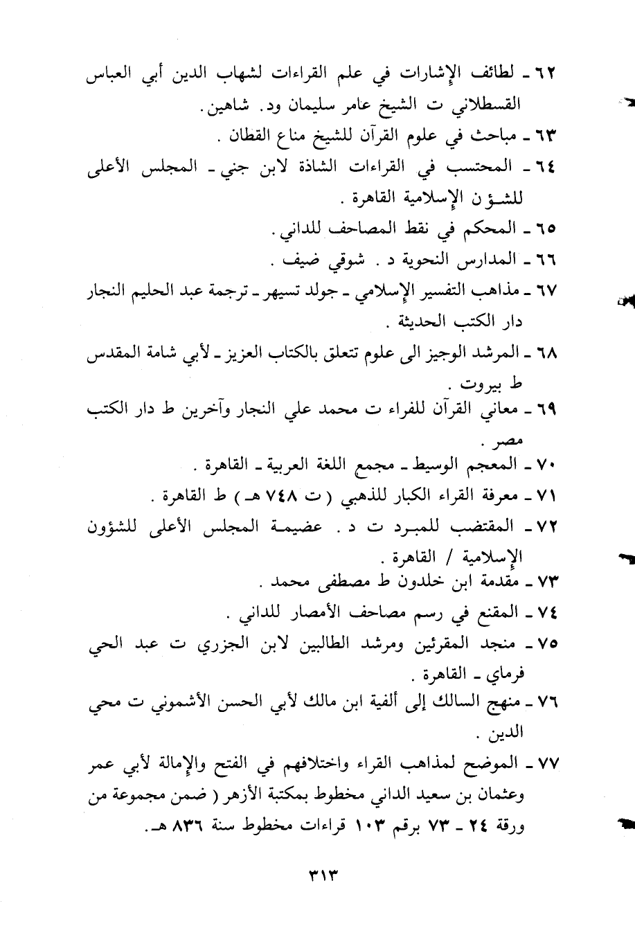 77- والموضح لمذاهب الثراي واختلافهم في الفتح والإمالة لأبي عمر وعثمان بن سعيد الداني مخطوط بمكتبة الأزهر "ضمن مجموعة من ورقة 24- 73 برقم 103 قراءات مخطوطة سنة 836هـ.