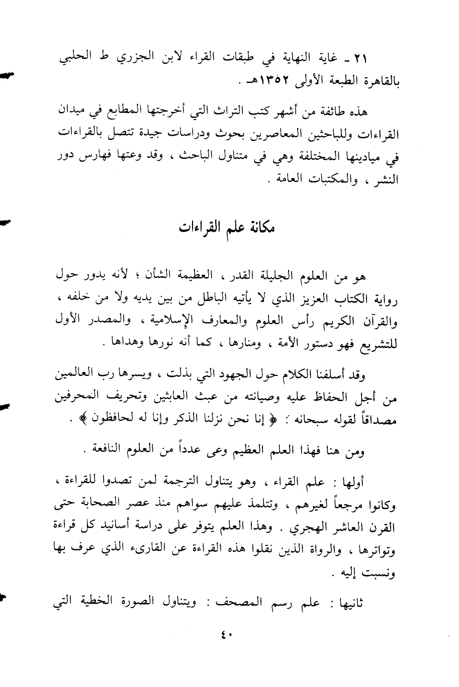 أولها: علم القراء، وهو يتناول الترجمة لمن تصدوا للقراءة، وكانوا مرجعًا لغيرهم، وتتلمذ عليهم سواهم منذ عصر الصحابة حتى القرن العاشر الهجري. وهذا العلم يتوفر على دراسة أسانيد كل قراءة وتواترها، والرواة الذين نقلوا هذه القراءة عن القارئ الذي عرف بها ونسبت إليه.