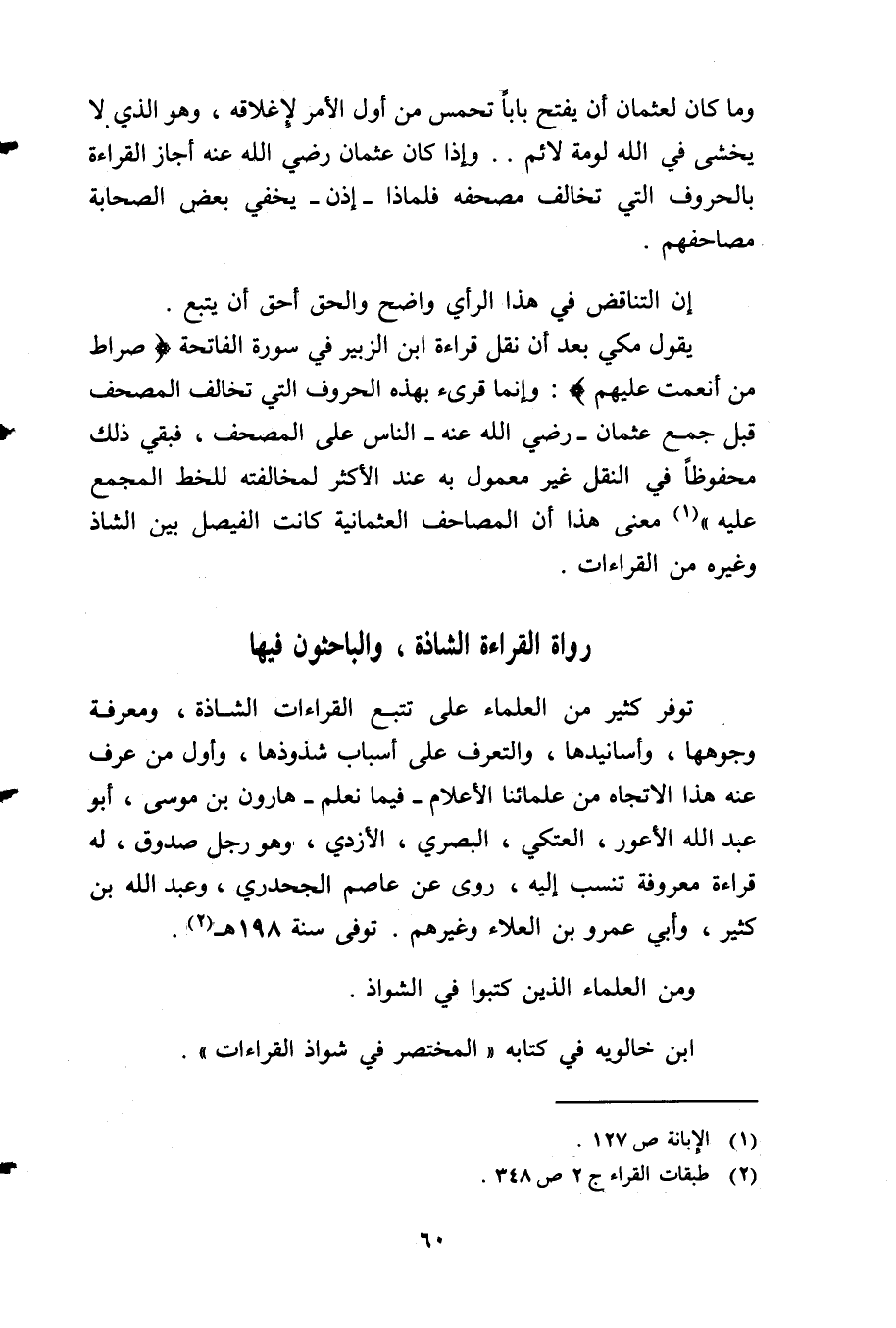 يقول مكي بعد أن نقل قراءة ابن الزبير في سورة الفاتحة "صراط من أنعمت عليهم": وإنما قرئ بهذه الحروف التي تخالف المصحف قبل جمع عثمان -رضي الله عنه- الناس على المصحف. فبقي ذلك محفوظًا في النقل غير معمول به عند الأكثر لمخالفته للخط المجمع عليه"1 معنى هذا أن المصاحف العثمانية كانت الفصل بين الشاذ وغيره من القراءات.