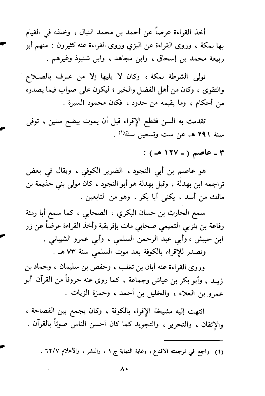 انتهت إليه مشيخة الإقراء بالكوفة، وكان يجمع بين الفصاحة، والإتقان، والتحرير، والتجويد كما كان أحسن الناس صوتًا بالقرآن.