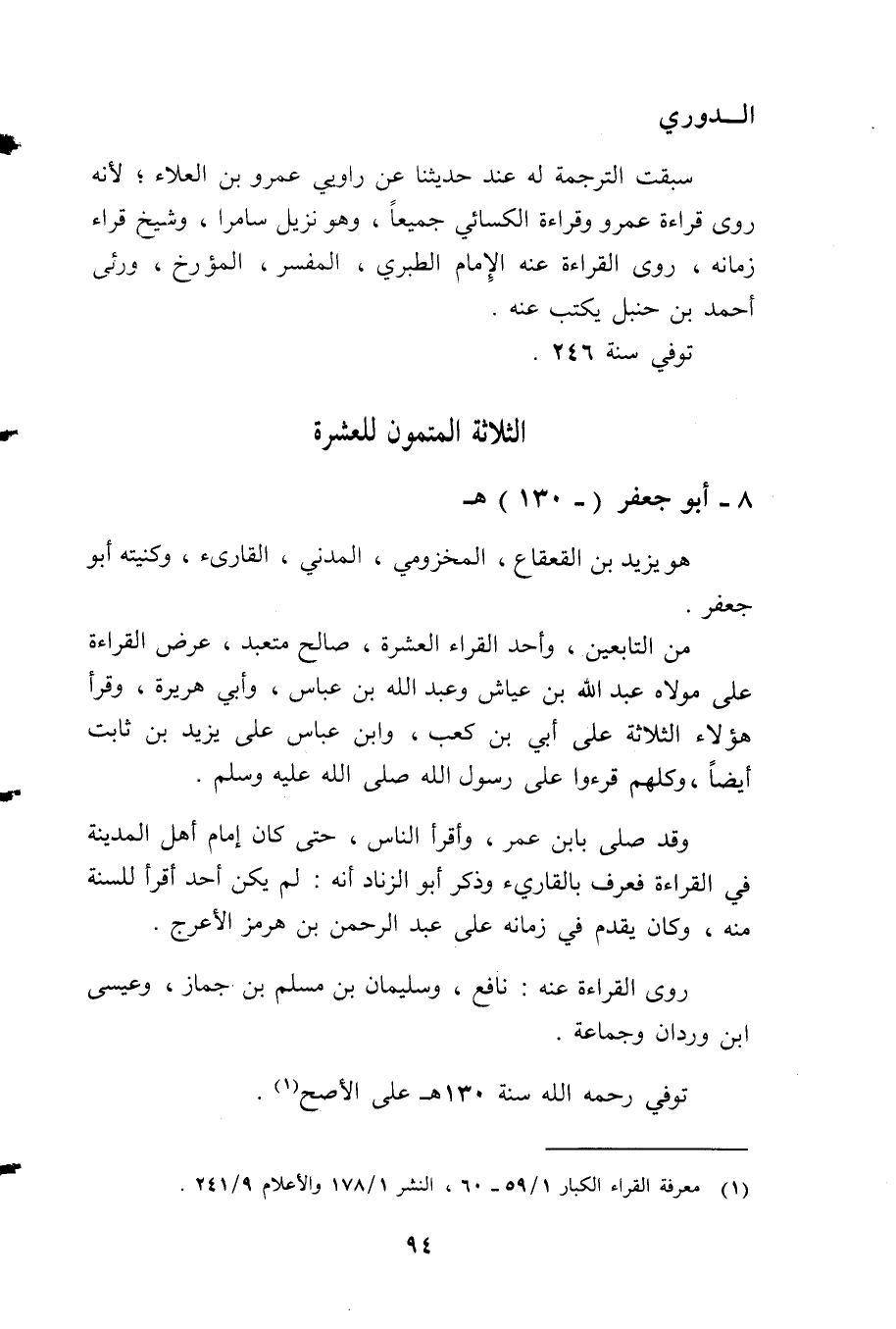 1 معرفة القراء الكبار 1/ 59- 60، النشر 1/ 178، والأعلام 9/ 241.
