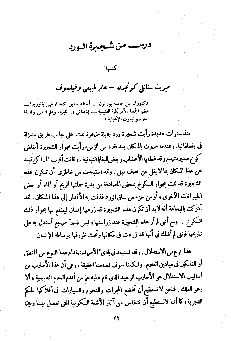 منذ سنوات عديدة رأيت شجيرة ورد جميلة مزهرة نمت على جانب طريق منعزلة في بنسلفانيا. وعندما مررت بالمكان بعد فترة من الزمن، رأيت بجوار الشجيرة أنقاض كوخ صغير متهدم وقد غطتها الأعشاب وبعض البقايا النباتية. وكانت أقرب المساكن تبعد عن هذا المكان بما لا يقل عن نصف ميل. وقد استبعدت من خاطري ان تكون هذه الشجرة قد نمت بجوار الكوخ بمحض المصادفة من بذرة حملتها الريح أو الماء أو بعض الحيوانات الاخرى، أو من جزيء من ساق الورد قذفت به الاقدار إلى هذا المكان. لقد أدركت بالبداهة انه لابد ان تكون هذه الشجيرة قد زرعها انسان لينتفع بها بجوار ذلك الكوخ، ومع انني لم أر هذه الشجيرة عند زراعتها وليس لدي مرجع استدل به على تاريخها فانني لم أشك في أنها قد زرعت في مكانها وتحت ظروفها بوساطة الانسان.