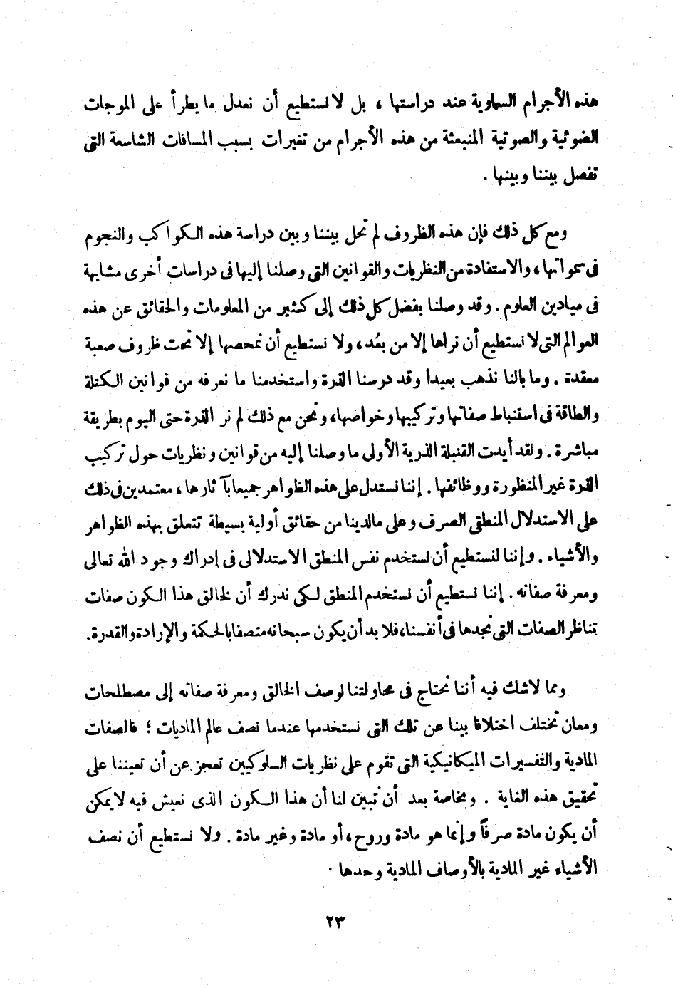 ومع كل ذلك فان هذه الظروف لم تحل بيننا وبين دراسة هذه الكوكب والنجوم في سمواتها، والاستفادة من النظريات والقوانين التي وصلنا اليها في دراسات اخرى مشابهة في ميادين العلوم. وقد وصلنا بفض كل ذلك إلى كثير من المعلومات والحقائق عن هذه العوالم التي لا نستطيع ان نراها الا من بعد، ولا نستطيع ان نمحصها الا تحت ظروف صعبة معقدة. وما بالنا نذهب بعيدا وقد درسنا الذرة واستخدمنا ما نعرفه من قوانين الكتلة والطاقة في استنباط صفاتها وتركيبها وخواصها، ونحن مع ذ…لك لم نر الذرة حتى اليوم بطريقة مباشرة. ولقد ايدت القنبلة الذرية الأولى ما وصلنا اليه من قوانين ونظريات حول تركيب الذرة غير المنظورة ووظائفها. اننا نستدل على هذه الظواهر جميعا بآثارها، معتمدين في ذلك على الاستدلال المنطقي الصرف وعلى ما لدينا من حقائق اولية بسيطة تتعلق بهذه الظواهر والأشياء. واننا لنستطيع ان نستخدم نفس المنطق الاستدلالي في ادراك وجود الله تعالى ومعرفة صفاته. اننا نستطيع ان نستخدم المنطق لكي ندرك ان لخالق هذا الكون صفات تناظر الصفات التي نجدها في أنفسنا، فلابد ان يكون سبحانه متصفا بالحكمة والإرادة والقدرة.