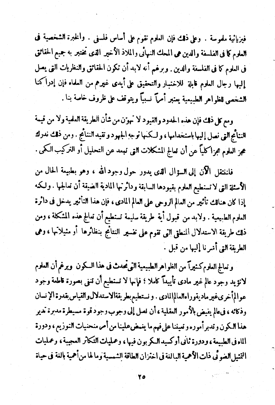 وتعالج العلوم كثيرا من الظواهر الطبيعية التي تحدث في هذا الكون، وبرغم ان العلوم لا تؤيد وجود عالم غير مادي تاييدا كاملا، فانها لا تستطيع ان تنفي بصورة قاطعة وجود عوالم اخرى غير مادية وراء العالم المادي. ونستطيع بطريقة الاستدلال والقياس بقدرة الإنسان وذكائه، في عالم يفيض بالأمور العقلية، ان نصل إلى وجوب وجود قوة مسيطرة مدبرة تدبر هذا الكون وتدبر أموره وتعيننا على فهم ما يغمض علينا من أمر منحنيات التوزيع، ودورة الماء في الطبيعة، ودورة ثاني أوكسيد الكربون فيها، وعمليات التكاثر العجيبة، وعمليات التمثيل الضوئي ذات الاهمية البالغة في اختزان الطاقة الشمسية وما لها من أهمية بالغة في حياة