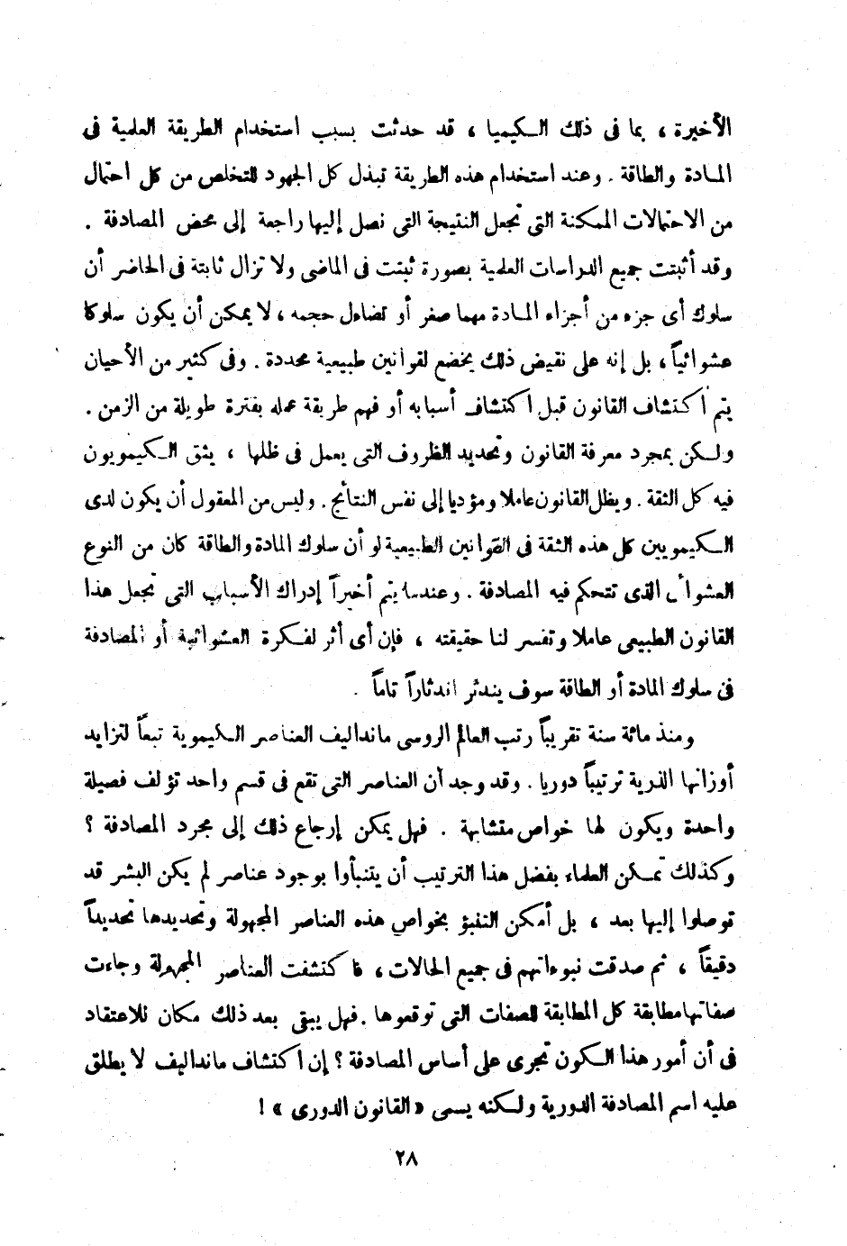 ومنذ مائة سنة تقريبا رتب العالم الروسي مانداليف العناصر الكيماوية تبعا لتزايد اوزانها الذرية ترتيبا دوريا. وقد وجد ان العناصر التي تقع في قسم واحد تؤلف فصيلة واحدة ويكون لها خواص متشابهة، فهل يمكن ارجاع ذلك إلى مجرد المصادفة؟