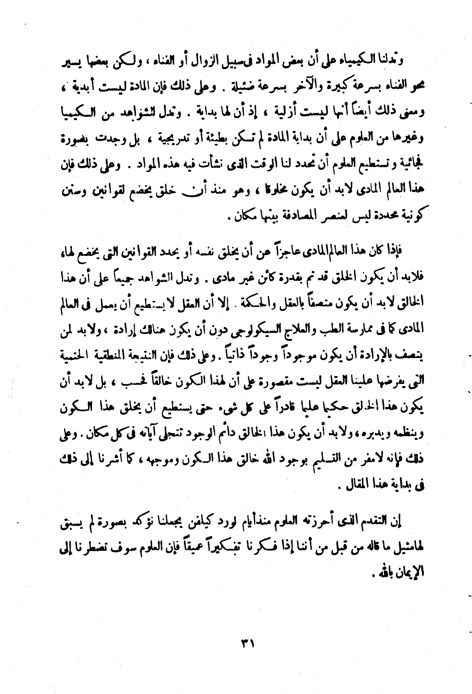 وتدلنا الكيمياء، على ان بعض المواد في سبيل الزوال او الفناء، ولكن بعضها يسير نحو الفناء بسرعة كبيرة والآخر بسرعة ضئيلة. وعلى ذلك فان المادة ليست أبدية، ومعنى ذلك ايضا انها ليست أزلية، إذ ان لها بداية. وتدل الشواهد من الكيمياء وغيرها من العلوم على ان بداية المادة لم تكن بطيئة او تدريجية، بل اوجدت بصورة فجائية، وتستطيع العلوم ان تحدد لنا الوقت الذي نشأت فيه هذه المواد. وعلى ذلك فان هذا العالم المادي لا بد ان يكون مخلوقا، وهو منذ ان خلق يخضع لقوانين وسنن كونية محددة ليس لعنصر المصادفة بينها مكان.