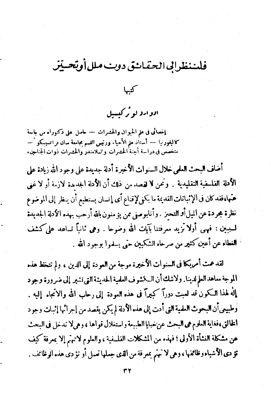 لقد عمت أمريكا في السنوات الأخيرة موجة من العودة إلى الدين، ولم تتخط هذه الموجة معاهد العلم لدينا. ولا شك ان الكشوف العلمية الحديثة التي تشير إلى ضرورة وجود إله لهذا الكون قد لعبت دورا كبيرا في هذه العودة إلى رحاب الله والاتجاه اليه. وطبيعي ان البحوث العلمية التي أدت إلى هذه الادلة لم يكن يقصد من اجرائها إثبات وجود الخالق، فغاية العلوم هي البحث عن خبايا الطبيعة واستغلال قواها، وهي لا تدخل في البحث عن مشكلة النشأة الأولى، فهذه من المشكلات الفلسفية، والعلوم لا تهتم إلا بمعرفة كيف تؤدي الأشياء وظائفها، وهي لا تهتم بمعرفة من الذي جعلها تعمل او تؤدي هذه الوظائف.