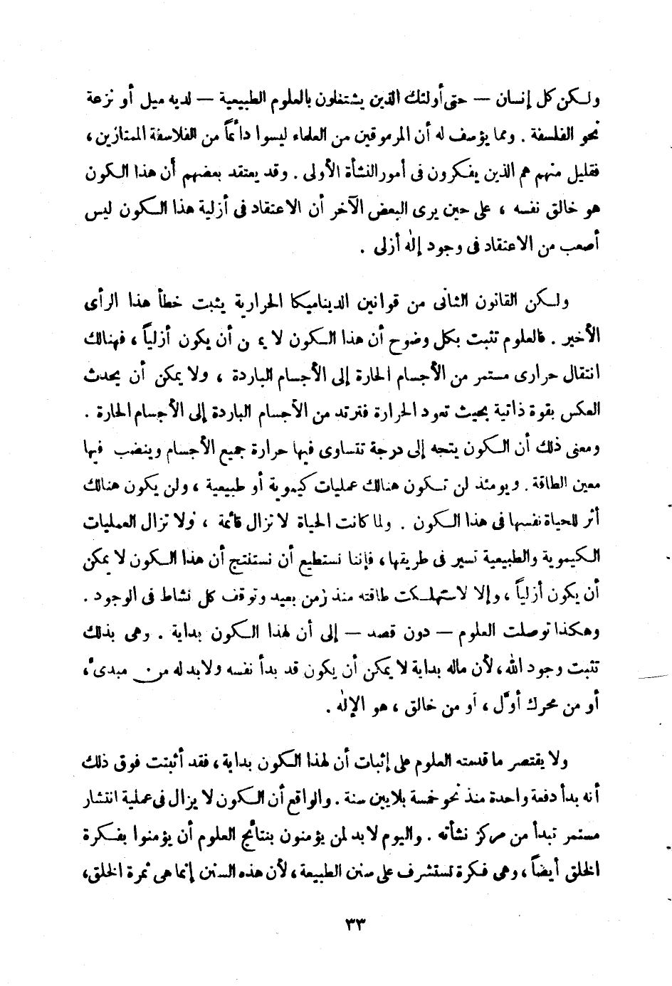 ولكن كل انسان – حتى أولئك الذين يشتغلون بالعلوم الطبيعية – لديه ميل او نزعة نحو الفلسفة. ومما يؤسف له ان المرموقين من العلماء ليسوا دائما من الفلاسفة الممتازين، فقليل منهم هم الذين يفكرون في أمور النشأة الأولى. وقد يعتقد بعضهم ان هذا الكون هو خالق نفسه، على حين يرى البعض الآخر ان الاعتقاد في أزلية هذا الكون ليس اصعب من الاعتقاد في وجود اله أزلي.