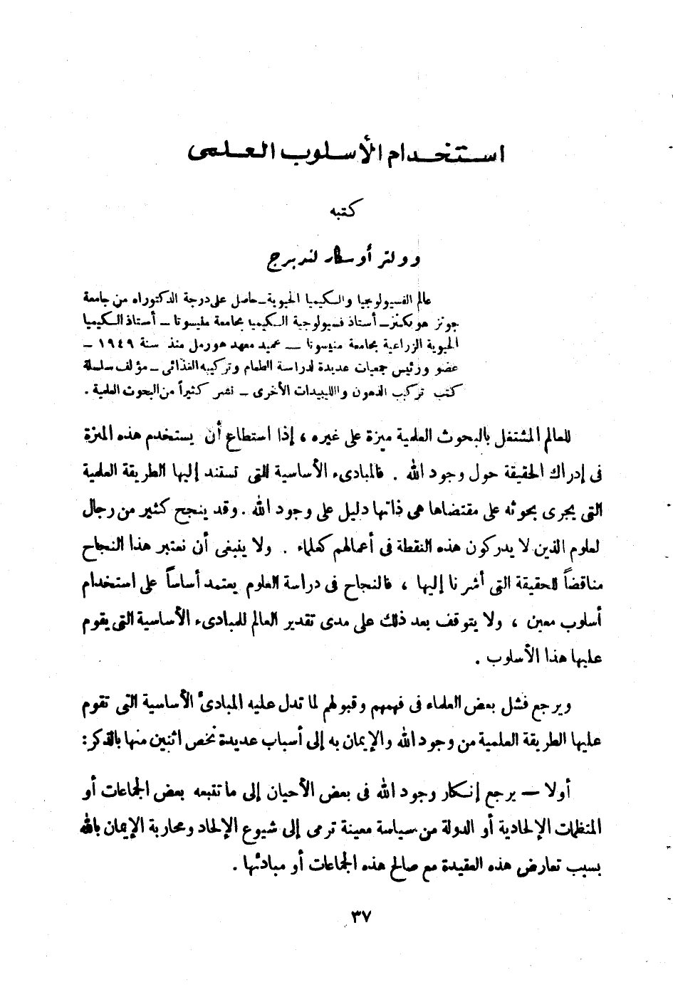 للعالم المشتغل بالبحوث العلمية ميزة على غيره، واذا استطاع ان يستخدم هذه الميزة في ادراك الحقيقة حول وجود الله. فالمبادئ الأساسية التي تستند اليها الطريقة العلمية التي يجري بحوثه على مقتضاها هي ذاتها دليل على وجود الله. وقد ينجح كثير من رجال العلوم الذين لا يدركون هذه النقطة في أعمالهم كعلماء. ولا ينبغي ان نعتبر هذا النجاح مناقضا للحقيقة التي أشرنا اليها، فالنجاح في دراسة العلوم يعتمد اساسا على استخدام أسلوب معين، ولا يتوقف بعد ذلك على مدى تقدير العالم للمبادئ الأساسية التي يقوم عليها هذا الأسلوب.