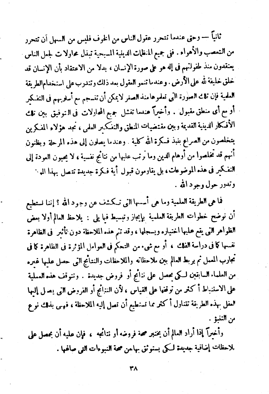 فما هي الطريقة العلمية وما هي أسسها التي تكشف عن وجود الله؟ اننا نستطيع ان نوضح خطوات الطريقة العلمية بايجاز وتبسط فيما يلي: يلاحظ العالم اولا بعض الظواهر التي يقع عليها اختياره ويسجلها، وقد تتم هذه الملاحظة دون تأثير في الظاهرة نفسها كما في دراسة الفلك، او مع شيء من التحكم في العوامل المؤثرة في الظاهرة كما في تجارب المعمل ثم يربط العالم بين ملاحظاته والملاحظات والنتائج التي حصل عليها غيره من العلماء السابقين لكي يحصل على نتائج او فروض جديدة. وتتوقف هذه العملية على الاستنباط اكثر من توقفها على القياس، لان النتائج او الفروض التي يصل اليها العقل بهذه الطريقة تتناول اكثر مما تستطيع ان تصل اليه الملاحظة، فهي بذلك نوع من التنبؤ.