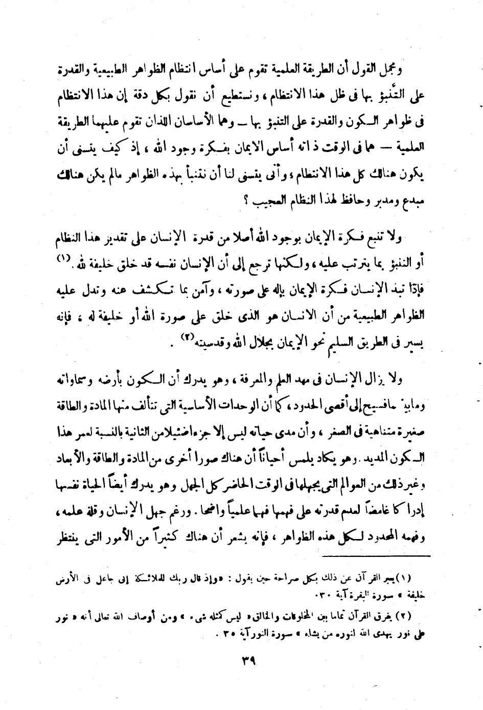 ومجمل القول ان الطريقة العلمية تقوم على أساس انتظام الظواهر الطبيعية والقدرة على التنبؤ بها في ظل هذا الانتظام، ونستطيع ان نقول بكل دقة: ان هذا الانتظام في ظواهر الكون والقدرة على التنبؤ بها – وهما الأساسان اللذان تقوم عليهما الطريقة العلمية – هما في الوقت ذاته أساس الإيمان بفكرة وجود الله، إذ كيف يتسنى ان يكون هنالك كل هذا الانتظام، وأنى يتسنى لنا أن نتنبأ بهذه الظواهر ما لم يكن هنالك مبدع ومدبر وحافظ لهذا النظام العجيب؟