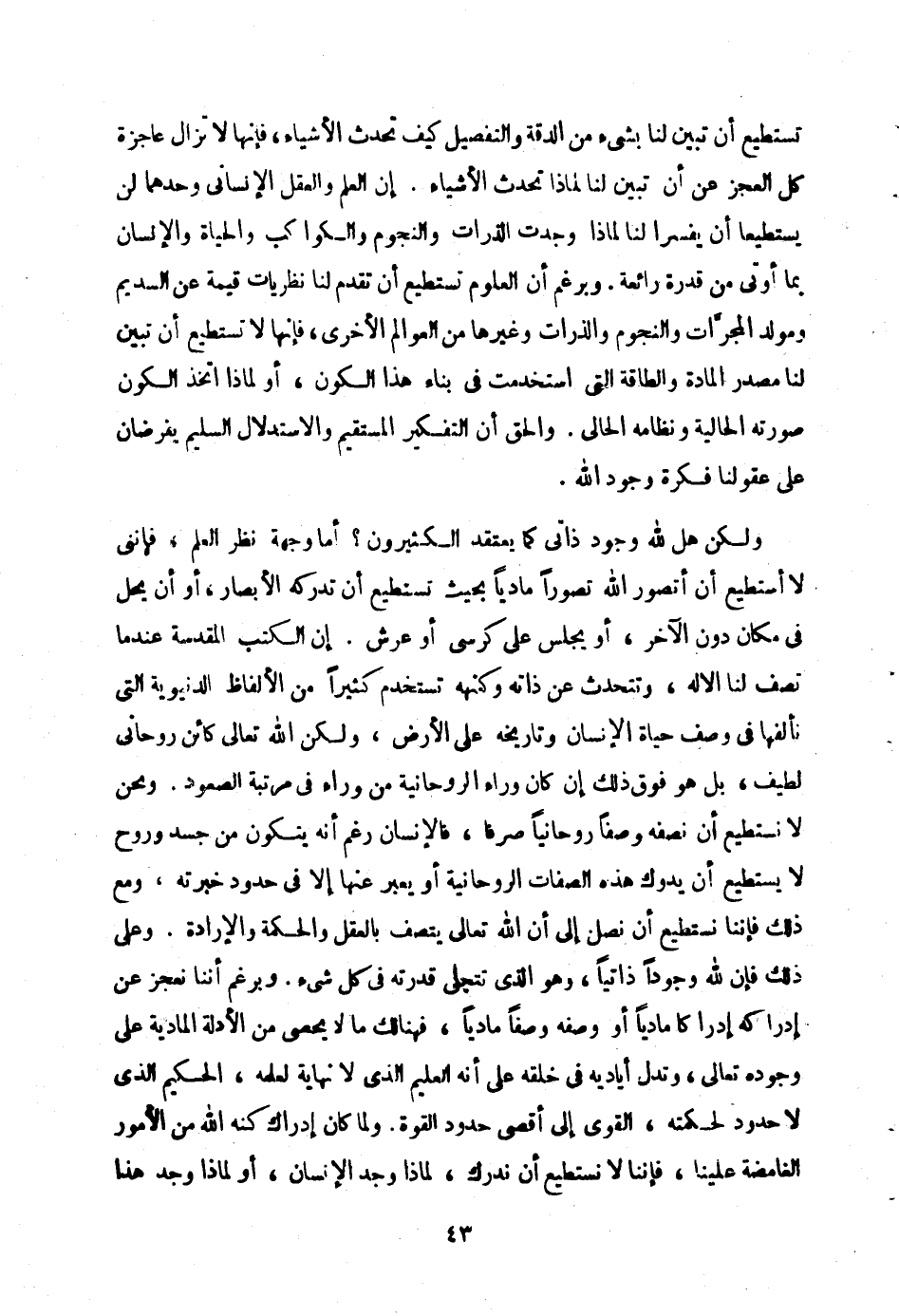 تستطيع أن تبين لنا بشيء من الدقة والتفصيل كيف تحدث الأشياء فإنها لا تزال عاجزة كل العجز عن أن تبين لنا لماذا تحدث الأشياء وإن العلم والعقل والإنسان وحدهما لن يستطيعا أن يفسر لنا لماذا تحدث الأشياء إن العلم والعقل الإنسان وحدهما لن يستطيعا أن يفسرا لنا لماذا وجدت الذرات والنجوم والكواكب والحياة والإنسان بما أوتى من قدرة رائعة وبرغم أن العلوم تستطيع أن تقدم لنا نظريات قيمة عن السديم ومولد المجرات والنجوم والذرات وغيرها من العوالم الأخرى فإنها لا تستطيع أن تبين لنا مصدر المادة والطاقة التي استخدمت في بناء هذا الكون أو اتخذ الكون صورته الحالية ونظامه الحالي والحق أن التفكير المستقيم والاستدلال السليم يفرضان على عقولنا فكرة وجود الله.