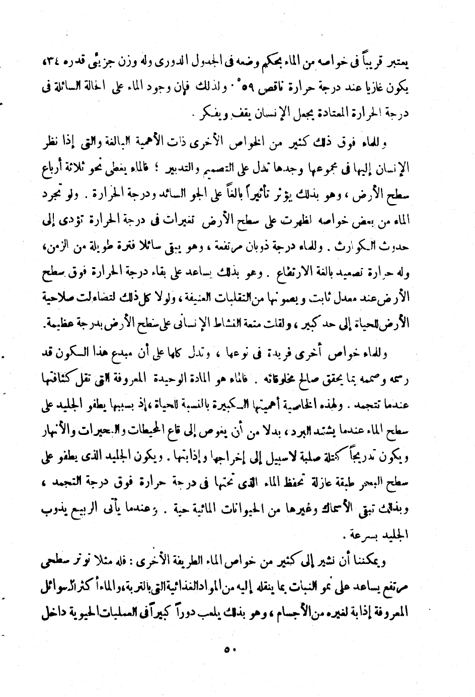 وللماء فوق ذلك كثير من الخواص الاخرى ذات الاهمية البالغة والتي اذا نظر الانسان اليها في مجموعها وجدها تدل على التصميم والتدبير، فالماء يغطي نحو ثلاثة أرباع سطح الارض، وهو بذلك يؤثر تأثيرا بالغا على الجو السائد ودرجة الحرارة. ولو تجرد الماء من بعض خواصه لظهرت على سطح الارض تغيرات في درجة الحرارة تؤدي إلى حدوث الكوارث. وللماء درجة ذوبان مرتفعة، وهو يبقى سائلا فترة طويلة من الزمن، وله حرارة تصعيد بالغة الارتفاع. وهو بذلك يساعد على بقاء درجة الحرارة فوق سطح الارض عند معدل ثابت ويصونها من التقلبات العنيفة، ولولا كل ذلك لتضاءلت صلاحية الارض للحياة إلى حد كبير، ولقلت متعة النشاط الانساني على سطح الارض بدرجة عظيمة.