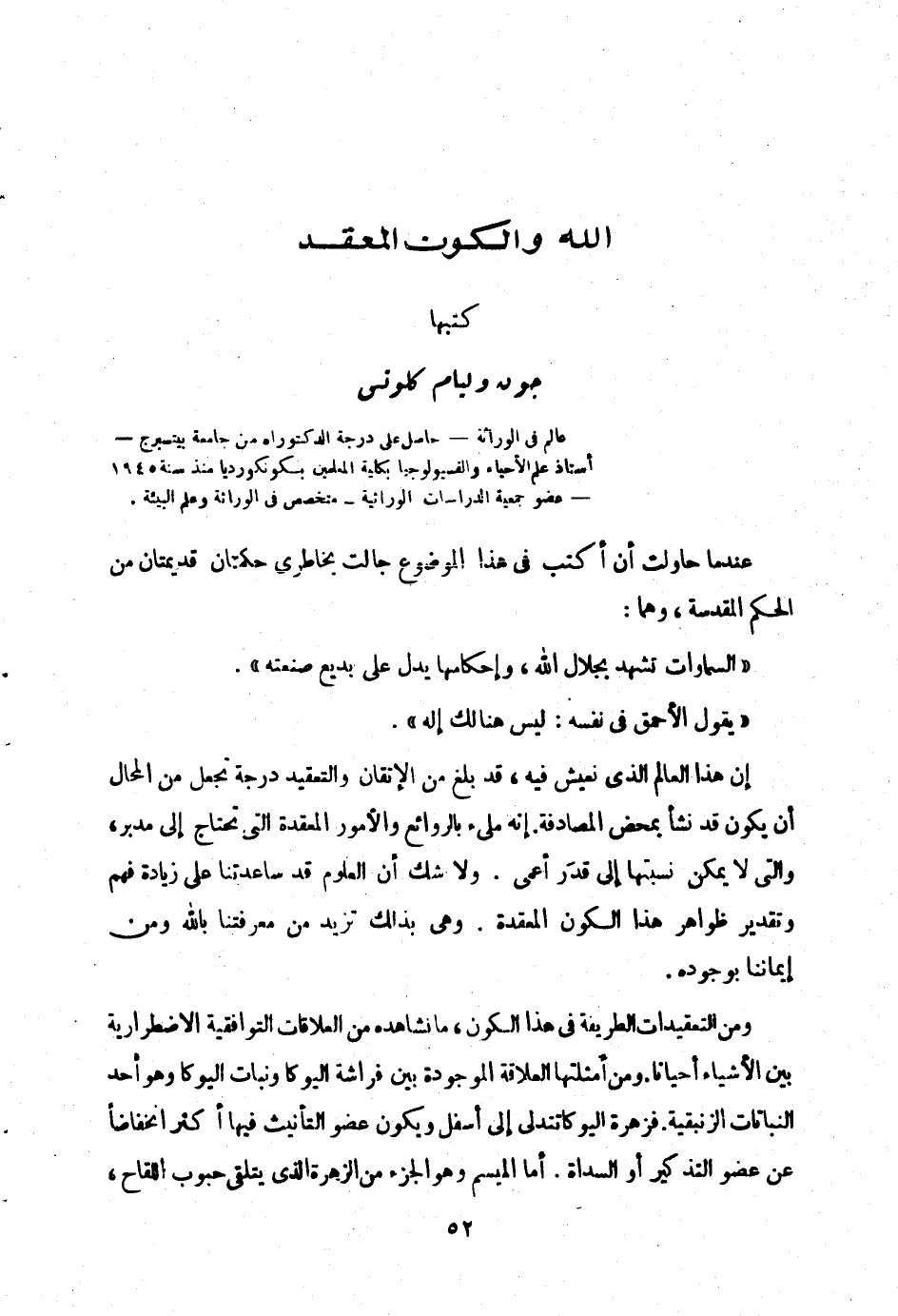 ان هذا العالم الذي نعيش فيه، قد بلغ من الاتقان والتعقيد درجة تجعل من المحال ان يكون قد نشأ بمحض المصادفة. انه مليء بالروائع والأمور المعقدة التي تحتاج إلى مدبر، والتي لا يمكن نسبتها إلى قدر أعمى. ولا شك ان العلوم قد ساعدتنا على زيادة فهم وتقدير ظواهر هذا الكون المعقدة. وهي بذلك تزيد من معرفتنا بالله ومن ايماننا بوجوده.