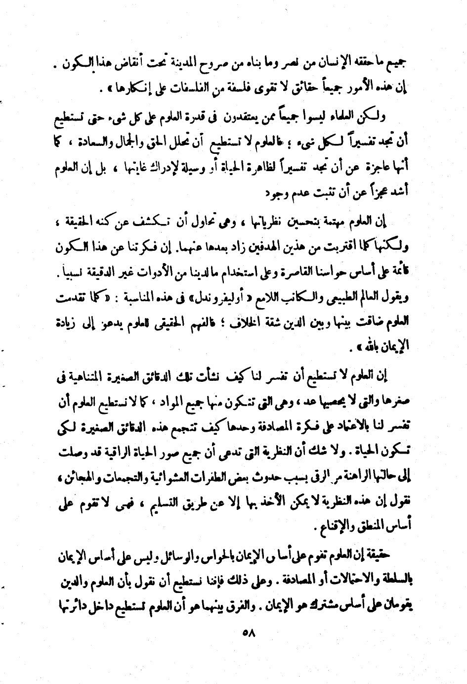 حقيقة ان العلوم تقوم على اساس الايمان بالحواس والوسائل، وليس على اساس الايمان بالسلطة والاحتمالات او المصادفة. وعلى ذلك فاننا نستطيع ان نقول بان العلوم والدين يقومان على اساس مشترك هو الايمان. والفرق بينهما هو ان العلوم تستطيع داخل دائرتها