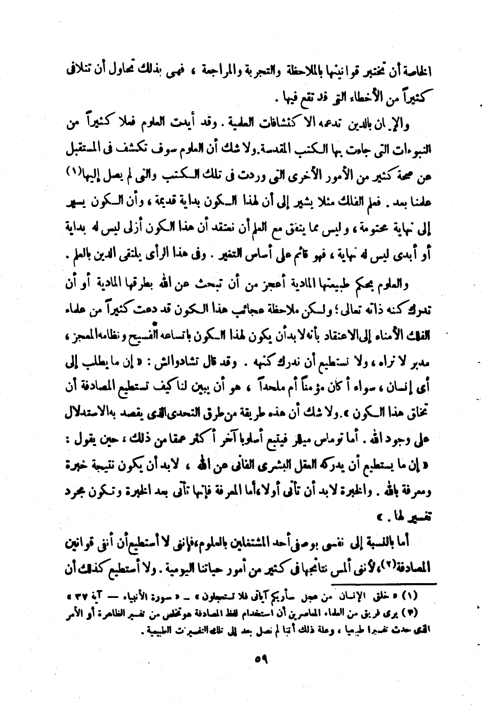 والايمان بالدين تدعمه الاكتشافات العلمية. وقد أيدت العلوم فعلا كثيرا من النبوءات التي جاءت بها الكتب المقدسة. ولاشك ان العلوم سوف تكشف في المستقبل عن صحة كثير من الامور الاخرى التي وردت في تلك الكتب والتي لم يصل اليها (¬1) علمنا بعد. فعلم الفلك مثلا يشير إلى ان لهذا الكون بداية قديمة، وان الكون يسير إلى نهاية محتومة، وليس مما يتفق مع العلم ان نعتقد ان هذا الكون أزلي ليس له بداية او أبدي ليس له نهاية، فهو قائم على أساس التغير. وفي هذا الرأي يلتقي الدين بالعلم.