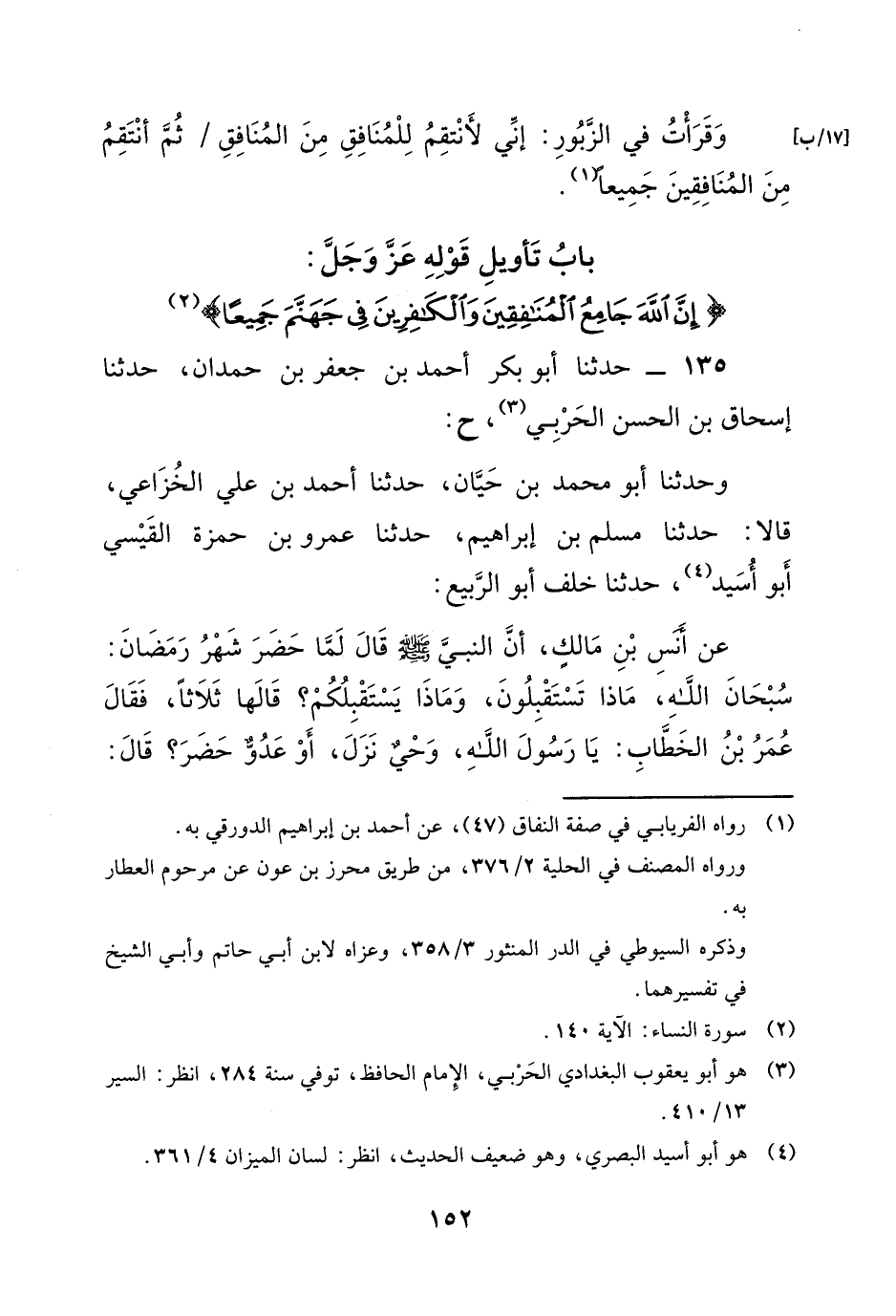 وَقَرَأْتُ فِي الزَّبُورِ: إِنِّي لأَنْتَقِمُ لِلْمُنَافِقِ مِنَ الْمُنَافِقِ ثُمَّ أَنْتَقِمُ مِنَ الْمُنَافِقِينَ جَمِيعًا ".