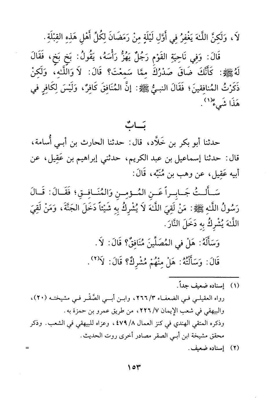 حَدَّثَنَا أَبُو بَكْرِ بْنُ خَلادٍ، قَالَ: حَدَّثَنَا الْحَارِثُ بْنُ أَبِي أُسَامَةَ، قَالَ: حَدَّثَنَا إِسْمَاعِيلُ بْنُ عَبْدِ الْكَرِيمِ، حَدَّثَنِي إِبْرَاهِيمُ بْنُ عَقِيلٍ، عَنْ أَبِيهِ عَقِيلٍ، عَنْ وَهْبِ بْنِ مُنَبِّهٍ، قَالَ: سَأَلْتُ جَابِرًا عَنِ الْمُؤْمِنِ وَالْمُنَافِقِ، فَقَالَ: قَالَ رَسُولُ اللَّهِ صَلَّى اللَّهُ عَلَيْهِ وَسَلَّمَ: «مَنْ لَقِيَ اللَّهَ لا يُشْرِكُ بِهِ شَيْئًا دَخَلَ الْجَنَّةَ، وَمَنْ لَقِيَ اللَّهَ يُشْرِكُ بِهِ دَخَلَ النَّارَ» .