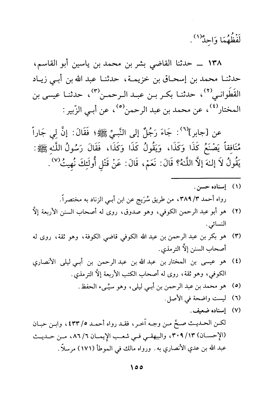 138 - حَدَّثَنَا الْقَاضِي بِشْرُ بْنُ مُحَمَّدِ بْنِ يَاسِينَ أَبُو الْقَاسِمِ، حَدَّثَنَا مُحَمَّدَ بْنَ إِسْحَاقَ بْنِ خُزَيْمَةَ، حَدَّثَنَا عَبْدُ اللَّهِ بْنُ أَبِي زِيَادٍ الْقَطَوَانِيُّ، حَدَّثَنَا بَكْرُ بْنُ عَبْدِ الرَّحْمَنِ، حَدَّثَنَا عِيسَى بْنُ الْمُخْتَارِ، عَنْ مُحَمَّدِ بْنِ عَبْدِ الرَّحْمَنِ، عَنْ أَبِي الزُّبَيْرِ، عَنْ جَابِرٍ: جَاءَ رَجُلٌ إِلَى النَّبِيِّ صَلَّى اللَّهُ عَلَيْهِ وَسَلَّمَ، فَقَالَ: " إِنَّ لِي جَارًا مُنَافِقًا يَصْنَعُ كَذَا وَكَذَا، وَيَقُولُ كَذَا وَكَذَا.