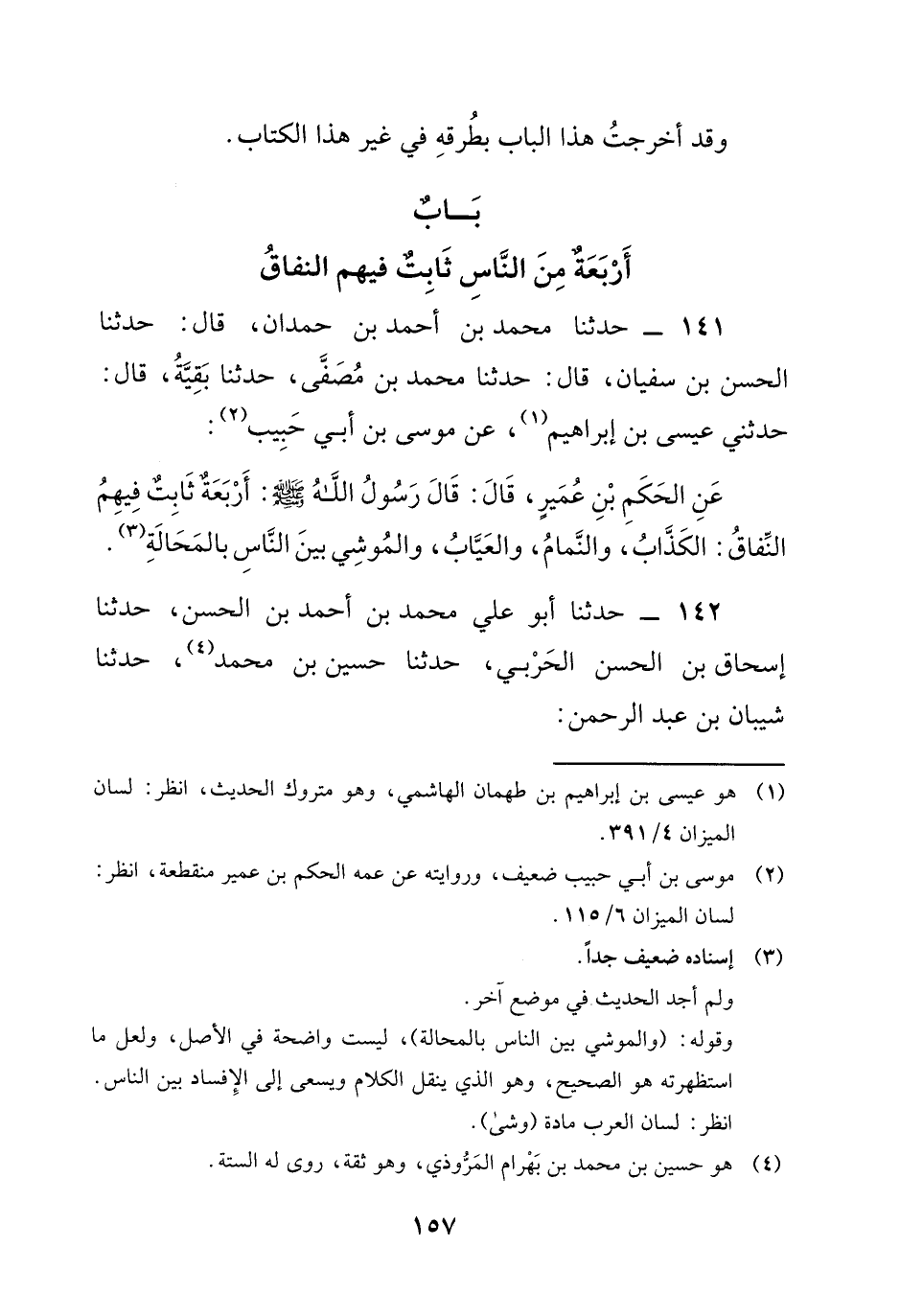 141 - حَدَّثَنَا مُحَمَّدُ بْنُ أَحْمَدَ بْنِ حَمْدَانَ، قَالَ: حَدَّثَنَا الْحَسَنُ بْنُ سُفْيَانَ، قَالَ: حَدَّثَنَا مُحَمَّدُ بْنُ مُصَفَّى، حَدَّثَنَا بَقِيَّةُ، قَالَ: حَدَّثَنِي عِيسَى بْنُ إِبْرَاهِيمَ، عَنْ مُوسَى بْنِ أَبِي حَبِيبٍ، عَنِ الْحَكَمِ بْنِ عُمَيْرٍ، قَالَ: قَالَ رَسُولُ اللَّهِ صَلَّى اللَّهُ عَلَيْهِ وَسَلَّمَ: " أَرْبَعَةُ ثَابِتٌ فِيهِمُ النِّفَاقُ: الْكَذَّابُ، وَالنَّمَّامُ، وَالْعَيَّابُ، وَالْمُوشِي بَيْنَ النَّاسِ بِالْمَحَالَةِ "