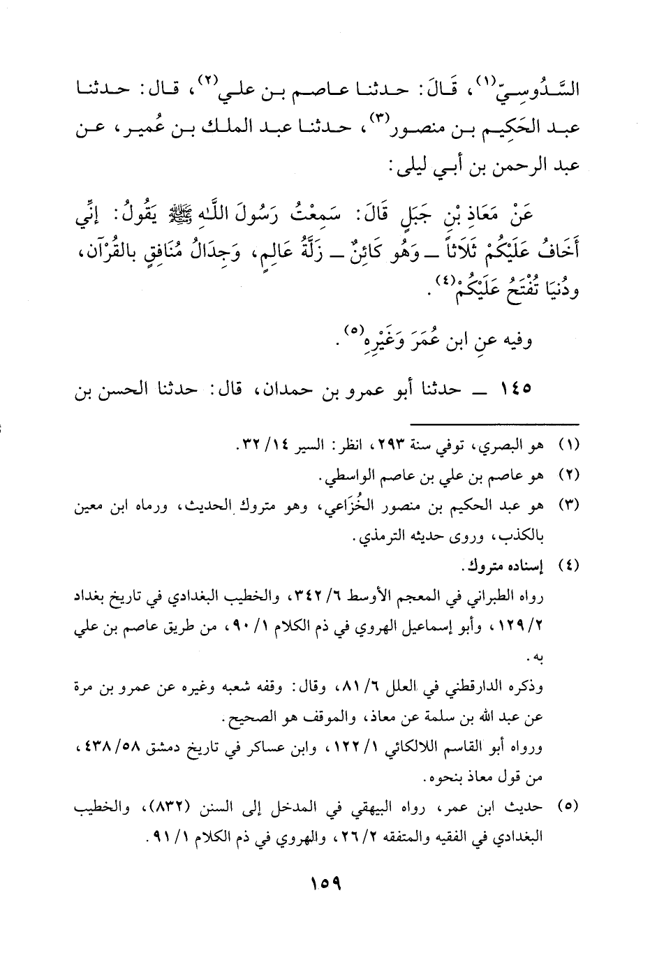 السَّدُوسِيُّ، قَالَ: حَدَّثَنَا عَاصِمُ بْنُ عَلِيٍّ، قَالَ: حَدَّثَنَا عَبْدُ الْحَكِيمِ بْنُ مَنْصُورٍ، حَدَّثَنَا عَبْدُ الْمَلِكِ بْنُ عُمَيْرٍ، عَنْ عَبْدِ الرَّحْمَنِ بْنِ أَبِي لَيْلَى، عَنْ مُعَاذِ بْنِ جَبَلٍ، قَالَ: سَمِعْتُ رَسُولَ اللَّهِ صَلَّى اللَّهُ عَلَيْهِ وَسَلَّمَ، يَقُولُ: «إِنِّي أَخَافُ عَلَيْكُمْ ثَلاثًا، وَهُوَ كَائِنٌ، زَلَّةُ عَالِمٍ، وَجِدَالُ مُنَافِقٍ بِالْقُرْآنِ، وَدُنْيَا تَفْتَحُ عَلَيْكُمْ» .