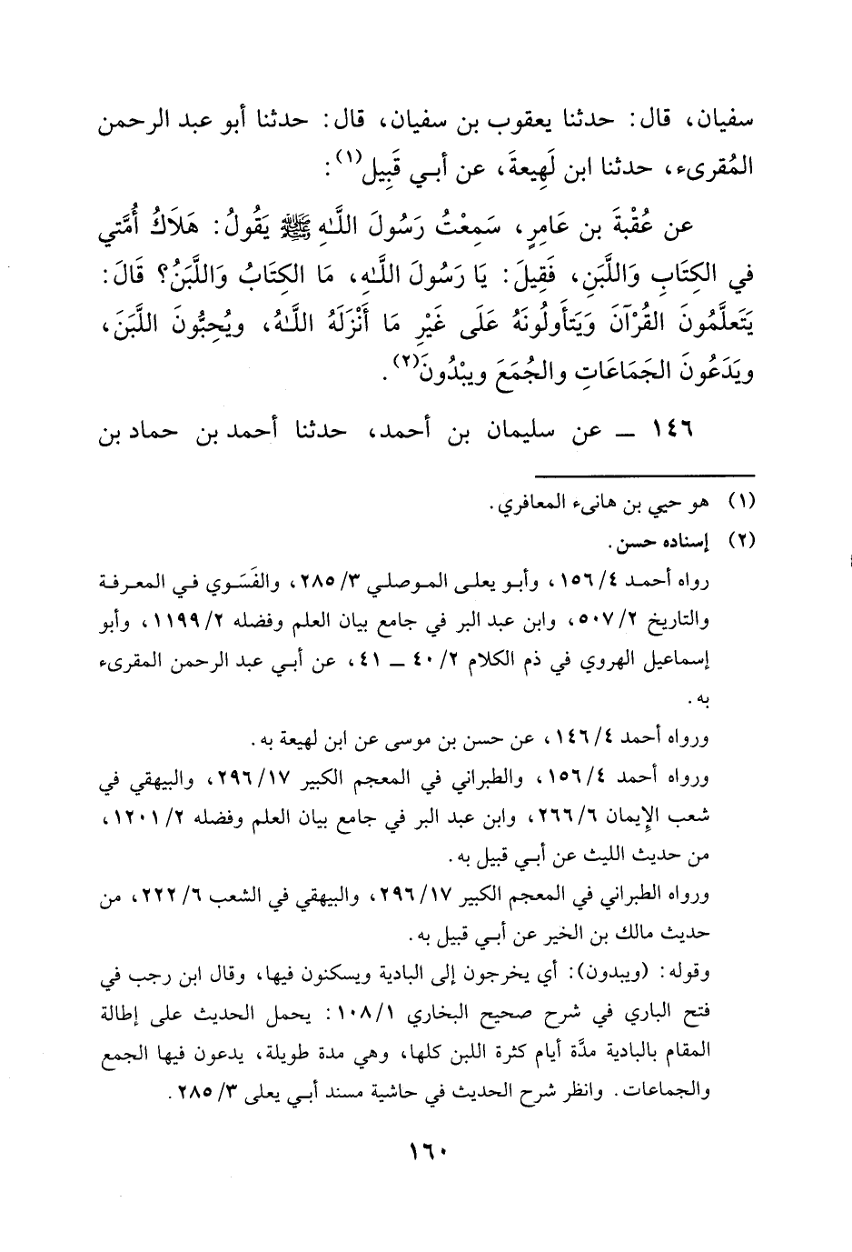 سُفْيَانَ، قَالَ: حَدَّثَنَا يَعْقُوبُ بْنُ سُفْيَانَ، قَالَ: حَدَّثَنَا أَبُو عَبْدِ الرَّحْمَنِ الْمُقْرِئُ، حَدَّثَنَا ابْنُ لَهِيعَةَ، عَنْ أَبِي قَبِيلٍ، عَنْ عُقْبَةُ بْنُ عَامِرٍ، سَمِعْتُ رَسُولَ اللَّهِ صَلَّى اللَّهُ عَلَيْهِ وَسَلَّمَ، يَقُولُ: " هَلاكُ أُمَّتِي فِي الْكِتَابِ وَاللَّبَنِ، فَقِيلَ: يَا رَسُولَ اللَّهِ، مَا الْكِتَابُ وَاللَّبَنُ؟ قَالَ: يَتَعَلَّمُونَ الْقُرْآنَ وَيَتَأَوَّلُونَهُ عَلَى غَيْرِ مَا أَنْزَلَهُ اللَّهُ، وَيُحِبُّونَ اللَّبَنَ، وَيَدْعُونَ الْجَمَاعَاتِ وَالْجَمْعِ وَيَبْدُونَ ".