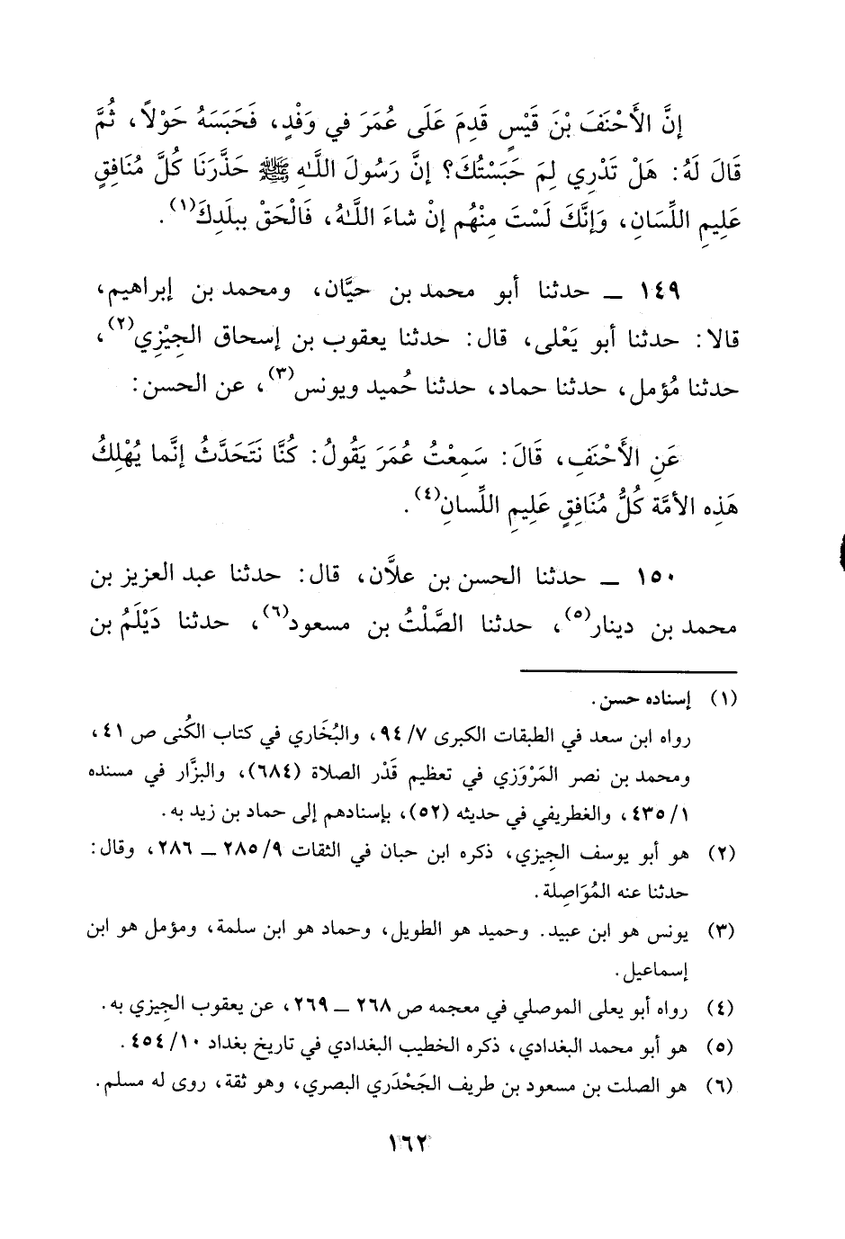 149 - حَدَّثَنَا أَبُو مُحَمَّدِ بْنُ حَيَّانَ، وَمُحَمَّدُ بْنُ إِبْرَاهِيمَ، قَالا: حَدَّثَنَا أَبُو يَعْلَى، قَالَ: حَدَّثَنَا يَعْقُوبُ بْنُ إِسْحَاقَ الْجِيزِيُّ، حَدَّثَنَا مُؤَمَّلٌ، حَدَّثَنَا حَمَّادٌ، حَدَّثَنَا حُمَيْدٌ وَيُونُسُ، عَنِ الْحَسَنِ، عَنِ الأَحْنَفِ، قَالَ: سَمِعْتُ عُمَرَ، يَقُولُ: كُنَّا نَتَحَدَّثُ «إِنَّمَا يُهْلِكُ هَذِهِ الأُمَّةَ كُلُّ مُنَافِقٍ عَلِيمُ اللِّسَانِ»