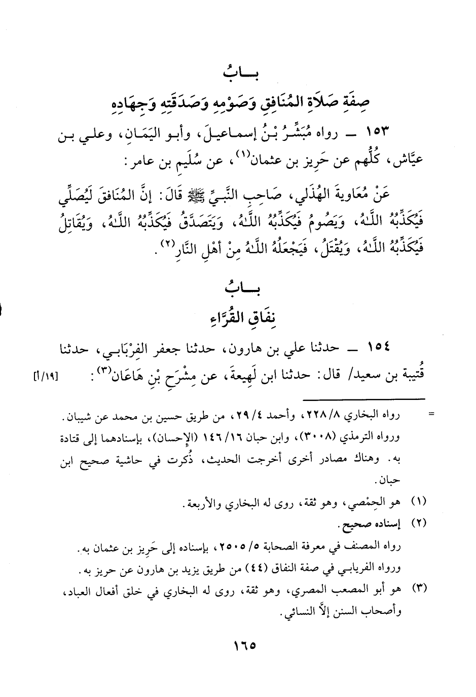 153 - رَوَاهُ مُبَشِّرُ بْنُ إِسْمَاعِيلَ، وَأَبُو الْيَمَانِ، وَعَلِيُّ بْنُ عَيَّاشٍ، كُلُّهُمْ عَنْ حَرِيزِ بْنِ عُثْمَانَ، عَنْ سُلَيْمِ بْنِ عَامِرٍ، عَنْ مُعَاوِيَةَ الْهُذَلِيِّ صَاحِبِ النَّبِيِّ صَلَّى اللَّهُ عَلَيْهِ وَسَلَّمَ، قَالَ: «إِنَّ الْمُنَافِقَ لَيُصَلِّي فَيَكْذِبُهُ اللَّهُ، وَيَصُومُ فَيَكْذِبُهُ اللَّهُ، وَيَتَصَدَّقُ فَيَكْذِبُهُ اللَّهُ، وَيُقَاتِلُ فَيَكْذِبُهُ اللَّهُ، وَيُقْتَلُ، فَيَجْعَلُهُ اللَّهُ مِنْ أَهْلِ النَّارِ»