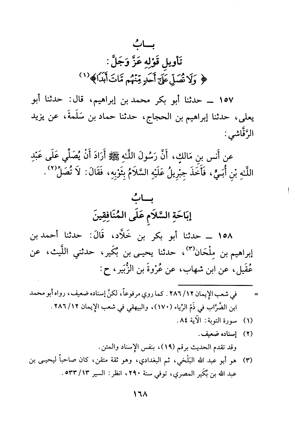157 - حَدَّثَنَا أَبُو بَكْرٍ مُحَمَّدُ بْنُ إِبْرَاهِيمَ، قَالَ: حَدَّثَنَا أَبُو يَعْلَى، حَدَّثَنَا إِبْرَاهِيمُ بْنُ الْحَجَّاجِ، حَدَّثَنَا حَمَّادُ بْنُ سَلَمَةَ، عَنْ يَزِيدَ الرَّقَاشِيِّ، عَنْ أَنَسِ بْنِ مَالِكٍ، أَنَّ رَسُولَ اللَّهِ صَلَّى اللَّهُ عَلَيْهِ وَسَلَّمَ " أَرَادَ أَنْ يُصَلِّي عَلَى عَبْدِ اللَّهِ بْنِ أُبَيٍّ، فَأَخَذَ جِبْرِيلُ عَلَيْهِ السَّلامُ بِثَوْبِهِ، فَقَالَ: لا تُصَلِّ "