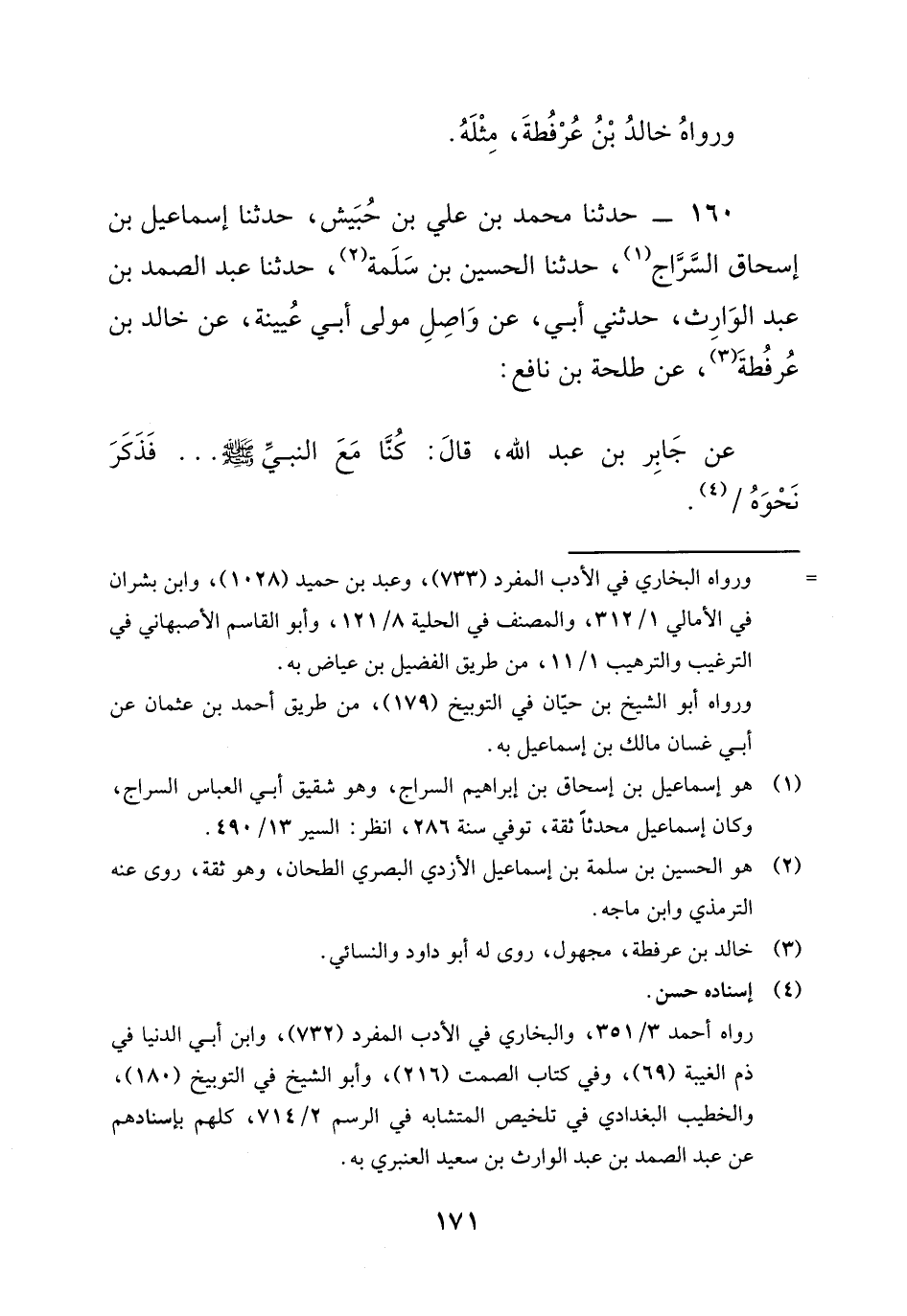160 - حَدَّثَنَا مُحَمَّدُ بْنُ عَلِيِّ بْنِ حُبَيْشٍ، حَدَّثَنَا إِسْمَاعِيلُ بْنُ إِسْحَاقَ السَّرَّاجُ، حَدَّثَنَا الْحُسَيْنُ بْنُ سَلَمَةَ، حَدَّثَنَا عَبْدُ الصَّمَدِ بْنُ عَبْدِ الْوَارِثِ، حَدَّثَنِي أَبِي، عَنْ وَاصِلٍ مَوْلَى أَبِي عُيَيْنَةَ، عَنْ خَالِدِ بْنِ عُرْفُطَةَ، عَنْ طَلْحَةَ بْنِ نَافِعٍ، عَنْ جَابِرِ بْنِ عَبْدِ اللَّهِ، قَالَ: كُنَّا مَعَ النَّبِيِّ صَلَّى اللَّهُ عَلَيْهِ وَسَلَّمَ. . . . . . . فَذَكَرَ نَحْوَهُ