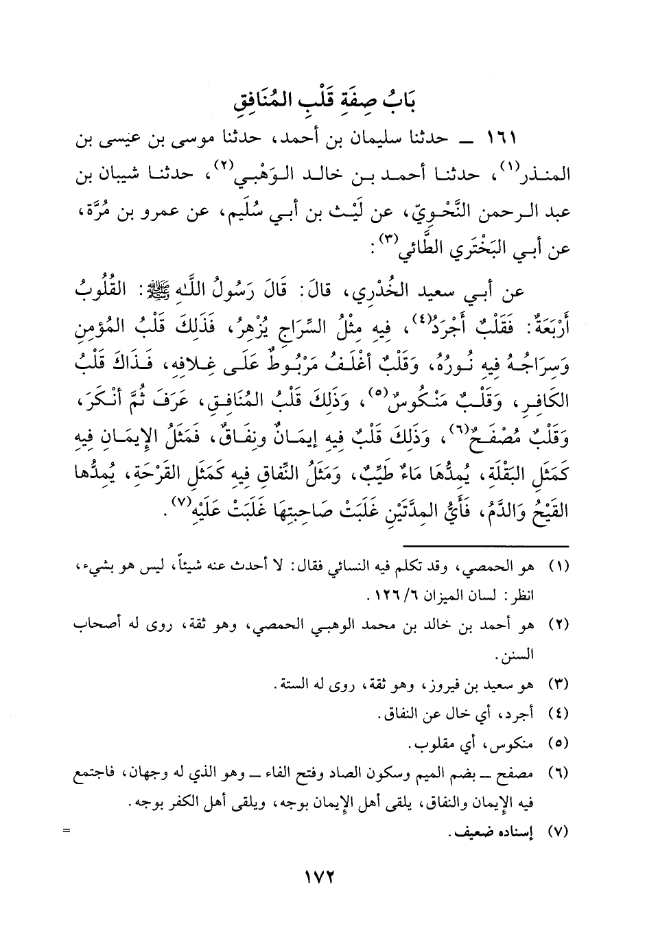 161 - حَدَّثَنَا سُلَيْمَانُ بْنُ أَحْمَدَ، حَدَّثَنَا مُوسَى بْنُ عِيسَى بْنِ الْمُنْذِرِ، حَدَّثَنَا أَحْمَدُ بْنُ خَالِدٍ الْوَهْبِيُّ، حَدَّثَنَا شَيْبَانُ بْنُ عَبْدِ الرَّحْمَنِ النَّحْوِيُّ، عَنْ لَيْثِ بْنِ أَبِي سُلَيْمٍ، عَنْ عَمْرِو بْنِ مُرَّةَ، عَنْ أَبِي الْبَخْتَرِيِّ الطَّائِيِّ، عَنْ أَبِي سَعِيدٍ الْخُدْرِيِّ، قَالَ: قَالَ رَسُولُ اللَّهِ صَلَّى اللَّهُ عَلَيْهِ وَسَلَّمَ: " الْقُلُوبُ أَرْبَعَةٌ: فَقَلْبٌ أَجْرَدُ، فِيهِ مِثْلُ السِّرَاجِ يُزْهِرُ، فَذَلِكَ قَلْبُ الْمُؤْمِنِ وَسِرَاجُهُ فِيهِ نُورُهُ، وَقَلْبٌ أَغْلَفُ مَرْبُوطٌ عَلَى غُلافِهِ، فَذَاكَ قَلْبُ الْكَافِرِ، وَقَلْبٌ مَنْكُوسٌ، وَذَلِكَ قَلْبُ الْمُنَافِقِ، عَرَفَ ثُمَّ أَنْكَرَ، وَقَلْبٌ مُصَفَّحٌ، وَذَلِكَ قَلْبٌ فِي إِيمَانٍ وَنِفَاقٍ، فَمَثَلُ الإِيمَانِ فِيهِ كَمَثَلِ الْبَقْلَةِ يَمُدُّهَا مَاءٌ طَيِّبٌ، وَمَثَلُ الْمُنَافِقِ فِيهِ كَمَثَلِ الْقُرْحَةِ، يَمُدُّهَا الْقَيْحُ وَالدَّمُ، فَأَيُّ الْمُدَّتَيْنِ غَلَبَتْ صَاحِبَتَهَا غَلَبَتْ عَلَيْهِ ".