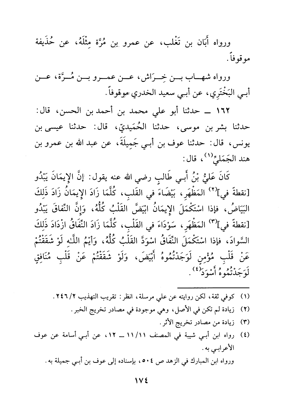 162 - حَدَّثَنَا أَبُو عَلِيٍّ مُحَمَّدُ بْنُ أَحْمَدَ بْنِ الْحَسَنِ، قَالَ: حَدَّثَنَا بِشْرُ بْنُ مُوسَى، حَدَّثَنَا الْحُمَيْدِيُّ، قَالَ: حَدَّثَنَا عِيسَى بْنُ يُونُسَ، قَالَ: حَدَّثَنَا عَوْفُ بْنُ أَبِي جَمِيلَةَ، عَنْ عَبْدِ اللَّهِ بْنِ عَمْرِو بْنِ هِنْدٍ الْجَمَلِيِّ، قَالَ: كَانَ عَلِيُّ بْنُ أَبِي طَالِبٍ رَضِيَ اللَّهُ عَنْهُ، يَقُولُ: «إِنَّ الإِيمَانَ يَبْدُو نُقْطَةً فِي الْمَظْهَرِ، بَيْضَاءَ فِي الْقَلْبِ، كُلَّمَا زَادَ الإِيمَانُ زَادَ ذَلِكَ الْبَيَاضُ، فَإِذَا اسْتُكْمِلَ الإِيمَانُ ابْيَضَّ الْقَلْبُ كُلُّهُ، وَإِنَّ النِّفَاقَ يَبْدُو نُقْطَةً فِي الْمَظْهَرِ، سَوْدَاءَ فِي الْقَلْبِ، كُلَّمَا زَادَ النِّفَاقُ ازْدَادَ ذَلِكَ السَّوَادُ، فَإِذَا اسْتُكْمِلَ النِّفَاقُ اسْوَدَّ الْقَلْبُ كُلُّهُ، وَايْمُ اللَّهِ لَوْ شَقَقْتُمْ عَنْ قَلْبِ مُؤْمِنٍ لَوَجَدْتُمُوهُ أَبْيَضَ، وَلَوْ شَقَقْتُمْ عَنْ قَلْبِ مُنَافِقٍ لَوَجَدْتُمُوهُ أَسْوَدَ» .