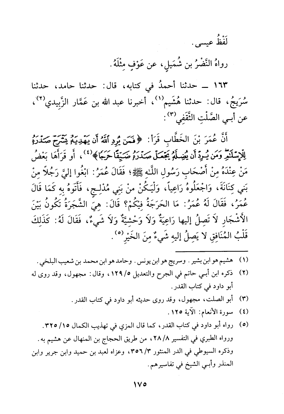 163 - حَدَّثَنَا أَحْمَدُ فِي كِتَابِهِ، قَالَ: حَدَّثَنَا حَامِدٌ، حَدَّثَنَا سُرَيْجٌ، قَالَ: حَدَّثَنَا هُشَيْمٌ، أَخْبَرَنَا عَبْدُ اللَّهِ بْنُ عَمَّارٍ الزَّبِيدِيُّ، عَنْ أَبِي الصَّلْتِ الثَّقَفِيِّ: " أَنَّ عُمَرَ بْنَ الْخَطَّابِ قَرَأَ: {فَمَنْ يُرِدِ اللَّهُ أَنْ يَهْدِيَهُ يَشْرَحْ صَدْرَهُ لِلإِسْلامِ وَمَنْ يُرِدْ أَنْ يُضِلَّهُ يَجْعَلْ صَدْرَهُ ضَيِّقًا حَرَجًا} [الأنعام: 125] ، أَوْ قَرَأَهَا بَعْضُ مَنْ عِنْدَهُ مِنْ أَصْحَابِ رَسُولِ اللَّهِ صَلَّى اللَّهُ عَلَيْهِ وَسَلَّمَ، فَقَالَ عُمَرُ: ابْغُوا إِلَيَّ رَجُلا مِنْ بَنِي كِنَانَةَ، وَاجْعَلُوهُ رَاعِيًا، وَلْيَكُنْ مِنْ بَنِي مُدْلَجٍ.