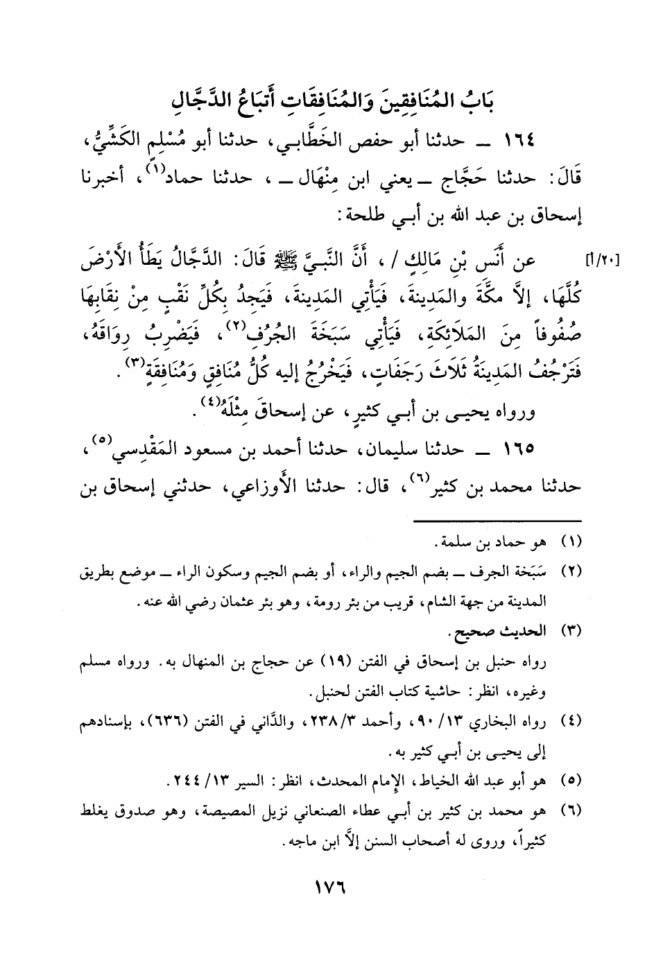164 - حَدَّثَنَا أَبُو حَفْصٍ الْخَطَّابِيُّ، حَدَّثَنَا أَبُو مُسْلِمٍ الْكَشِّيُّ، قَالَ: حَدَّثَنَا حَجَّاجُ يَعْنِي ابْنَ مِنْهَالٍ، حَدَّثَنَا حَمَّادٌ، أَخْبَرَنَا إِسْحَاقُ بْنُ عَبْدِ اللَّهِ بْنِ أَبِي طَلْحَةَ، عَنْ أَنَسِ بْنِ مَالِكٍ، أَنَّ النَّبِيَّ صَلَّى اللَّهُ عَلَيْهِ وَسَلَّمَ، قَالَ: «الدَّجَّالُ يَطَأُ الأَرْضَ كُلَّهَا، إِلا مَكَّةَ وَالْمَدِينَةَ، فَيَأْتِي الْمَدِينَةَ، فَيَجِدُ بِكُلِّ نَقْبٍ مِنْ نِقَابِهَا صُفُوفًا مِنَ الْمَلائِكَةِ، فَيَأْتِي سَبَخَةَ الْجَرْفِ، فَيَضْرِبُ رِوَاقَهُ، فَتَرْجُفُ الْمَدِينَةُ ثَلاثَ رَجَفَاتٍ، فَيَخْرُجُ إِلَيْهِ كُلُّ مُنَافِقٍ وَمُنَافِقَةٍ» .