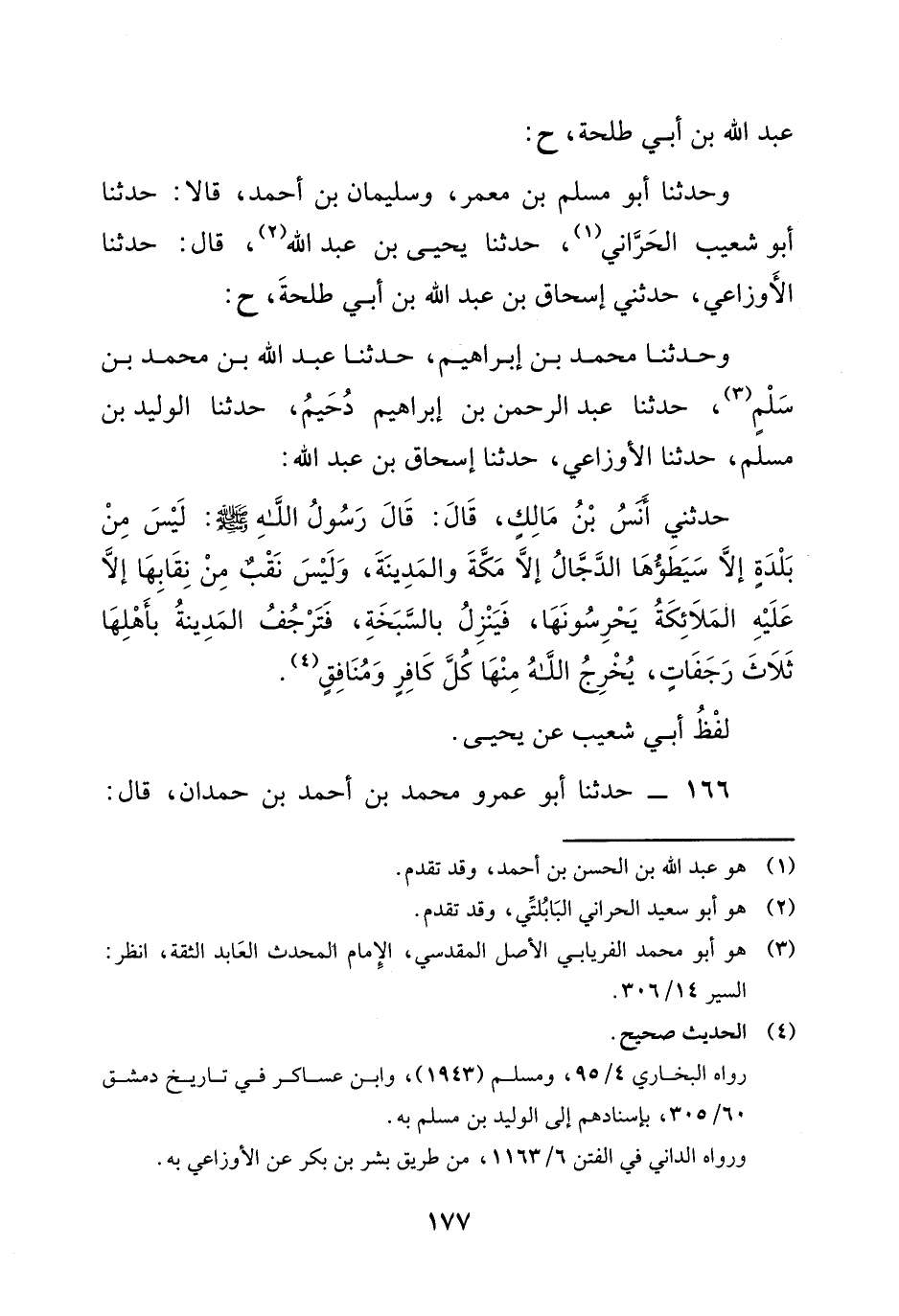 ح وَحَدَّثَنَا مُحَمَّدُ بْنُ إِبْرَاهِيمَ، حَدَّثَنَا عَبْدُ اللَّهِ بْنُ مُحَمَّدِ بْنِ سَلْمٍ، حَدَّثَنَا عَبْدُ الرَّحْمَنِ بْنُ إِبْرَاهِيمَ دُحَيْمٌ، حَدَّثَنَا الْوَلِيدُ بْنُ مُسْلِمٍ، حَدَّثَنَا الأَوْزَاعِيُّ، حَدَّثَنَا إِسْحَاقُ بْنُ عَبْدِ اللَّهِ، حَدَّثَنِي أَنَسُ بْنُ مَالِكٍ، قَالَ: قَالَ رَسُولُ اللَّهِ صَلَّى اللَّهُ عَلَيْهِ وَسَلَّمَ: «لَيْسَ مِنْ بَلْدَةٍ إِلا سَيَطَؤُهَا الدَّجَّالُ إِلا مَكَّةَ وَالْمَدِينَةَ، وَلَيْسَ نَقْبٌ مِنْ نِقَابِهَا إِلا عَلَيْهِ الْمَلائِكَةُ يَحْرُسُونَهَا، فَيَنْزِلُ بِالسَّبْخَةِ، فَتَرْجُفُ الْمَدِينَةُ بِأَهْلِهَا ثَلاثَ رَجَفَاتٍ، يُخْرِجُ اللَّهُ مِنْهَا كُلَّ كَافِرٍ وَمُنَافِقٍ» .