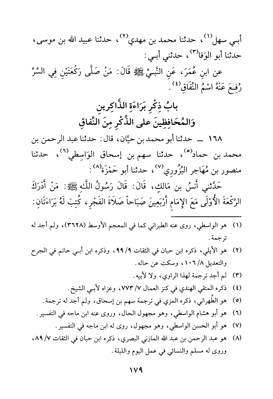 أَبِي سَهْلٍ، حَدَّثَنَا مُحَمَّدُ بْنُ مَهْدِيٍّ، حَدَّثَنَا عُبَيْدُ اللَّهِ بْنُ مُوسَى، حَدَّثَنَا أَبُو الْوَفَا، حَدَّثَنِي أَبِي، عَنِ ابْنِ عُمَرَ، عَنِ النَّبِيِّ صَلَّى اللَّهُ عَلَيْهِ وَسَلَّمَ، قَالَ: «مَنْ صَلَّى رَكْعَتَيْنِ فِي السِّرِّ رُفِعَ عَنْهُ اسْمُ النِّفَاقِ»
