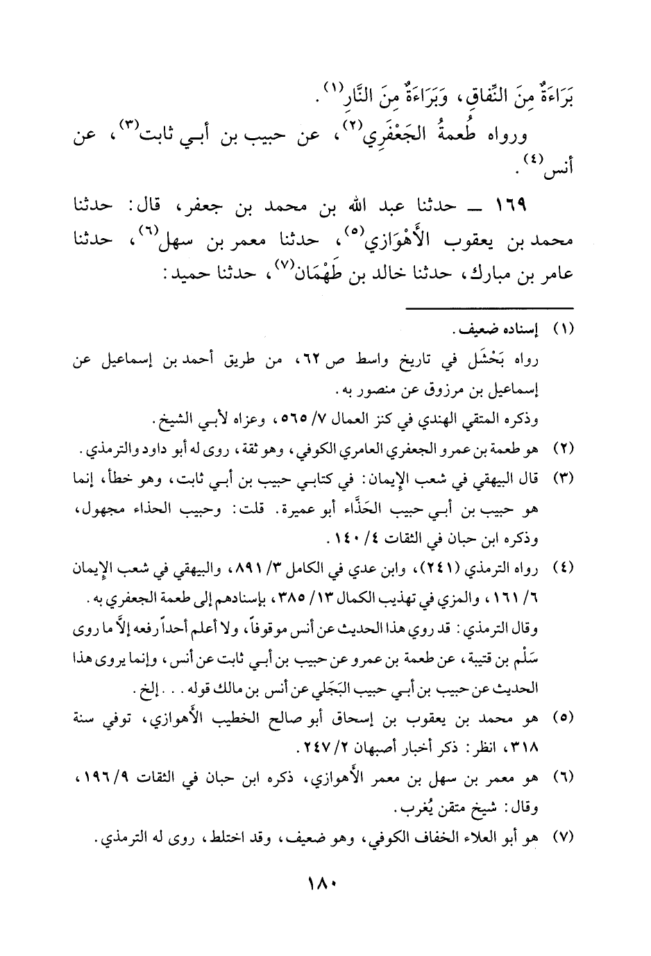 169 - حَدَّثَنَا عَبْدُ اللَّهِ بْنُ مُحَمَّدِ بْنِ جَعْفَرٍ، قَالَ: حَدَّثَنَا مُحَمَّدُ بْنُ يَعْقُوبَ الأَهْوَازِيُّ، حَدَّثَنَا مَعْمَرُ بْنُ سَهْلٍ، حَدَّثَنَا عَامِرُ بْنُ مُبَارَكٍ، حَدَّثَنَا خَالِدُ بْنُ طَهْمَانَ، حَدَّثَنَا حُمَيْدٌ،