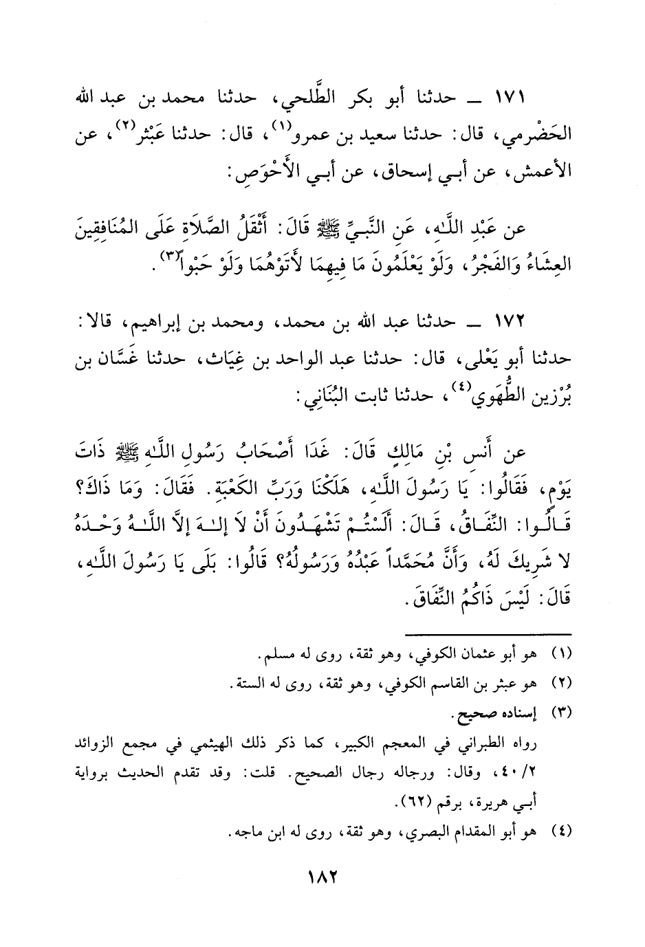 172 - حَدَّثَنَا عَبْدُ اللَّهِ بْنُ مُحَمَّدٍ، وَمُحَمَّدُ بْنُ إِبْرَاهِيمَ، قَالا: حَدَّثَنَا أَبُو يَعْلَى، قَالَ: حَدَّثَنَا عَبْدُ الْوَاحِدِ بْنُ غِيَاثٍ، حَدَّثَنَا غَسَّانُ بْنُ بُرْزِينَ الطُّهَوِيُّ، حَدَّثَنَا ثَابِتٌ الْبُنَانِيُّ، عَنْ أَنَسِ بْنِ مَالِكٍ، قَالَ: غَدَا أَصْحَابُ رَسُولِ اللَّهِ صَلَّى اللَّهُ عَلَيْهِ وَسَلَّمَ ذَاتَ يَوْمٍ، فَقَالُوا: " يَا رَسُولَ اللَّهِ، هَلَكْنَا وَرَبِّ الْكَعْبَةِ، فَقَالَ: وَمَا ذَاكَ؟ قَالُوا: النِّفَاقُ، قَالَ: أَلَسْتُمْ تَشْهَدُونَ أَنَّ لا إِلَهَ إِلا اللَّهُ وَحْدَهُ لا شَرِيكَ لَهُ، وَأَنَّ مُحَمَّدًا عَبْدُهُ وَرَسُولُهُ؟ قَالُوا: بَلَى يَا رَسُولَ اللَّهِ.