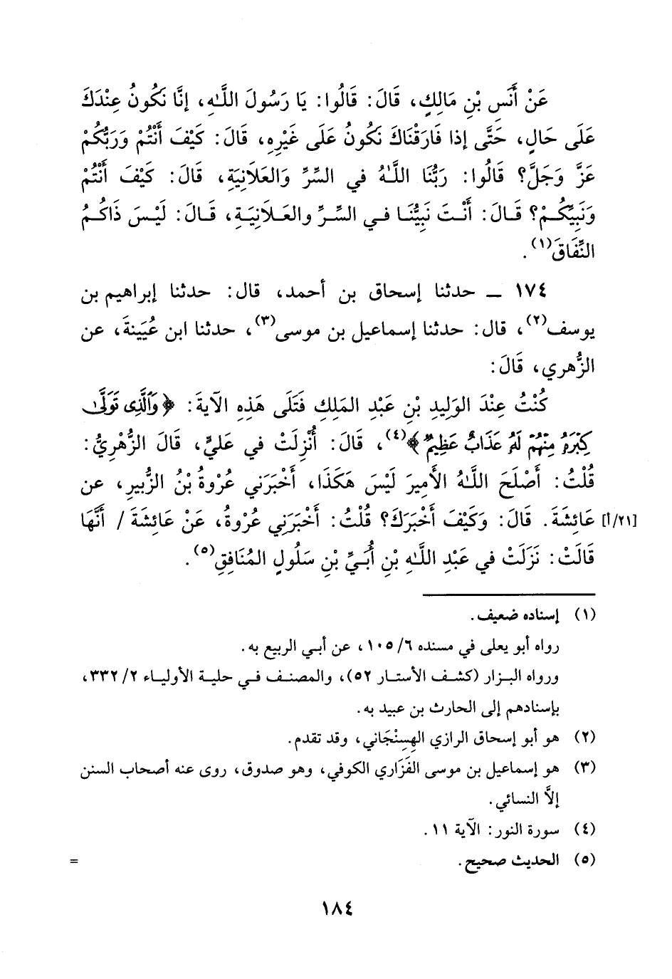 174 - حَدَّثَنَا إِسْحَاقُ بْنُ أَحْمَدَ، قَالَ: حَدَّثَنَا إِبْرَاهِيمُ بْنُ يُوسُفَ، قَالَ: حَدَّثَنَا إِسْمَاعِيلُ بْنُ مُوسَى، حَدَّثَنَا ابْنُ عُيَيْنَةَ، عَنِ الزُّهْرِيِّ، قَالَ: كُنْتُ عِنْدَ الْوَلِيدِ بْنِ عَبْدِ الْمَلِكِ فَتَلَى هَذِهِ الآيَةَ " {وَالَّذِي تَوَلَّى كِبْرَهُ مِنْهُمْ لَهُ عَذَابٌ عَظِيمٌ} [النور: 11] قَالَ: أُنْزِلَتْ فِي عَلِيٍّ.