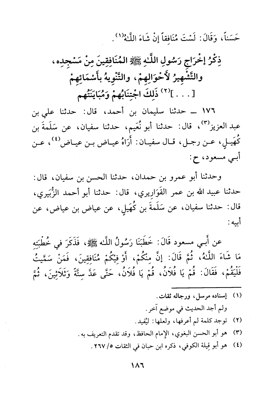 176 - حَدَّثَنَا سُلَيْمَانُ بْنُ أَحْمَدَ، قَالَ: حَدَّثَنَا عَلِيُّ بْنُ عَبْدِ الْعَزِيزِ، قَالَ: حَدَّثَنَا أَبُو نُعَيْمٍ، حَدَّثَنَا سُفْيَانُ، عَنْ سَلَمَةَ بْنِ كُهَيْلٍ، عَنْ رَجُلٍ، قَالَ سُفْيَانُ: أَرَاهُ عِيَاضُ بْنُ عِيَاضٍ، عَنْ أَبِي مَسْعُودٍ ح وَحَدَّثَنَا أَبُو عَمْرِو بْنُ حَمْدَانَ، حَدَّثَنَا الْحَسَنُ بْنُ سُفْيَانَ، قَالَ: حَدَّثَنَا عُبَيْدُ اللَّهِ بْنُ عُمَرَ الْقَوَارِيرِيُّ، قَالَ: حَدَّثَنَا أَبُو أَحْمَدَ الزُّبَيْرِيُّ، قَالَ: حَدَّثَنَا سُفْيَانُ، عَنْ سَلَمَةَ بْنِ كُهَيْلٍ، عَنْ عِيَاضِ بْنِ عِيَاضٍ، عَنْ أَبِيهِ، عَنْ أَبِي مَسْعُودٍ، قَالَ: خَطَبَنَا رَسُولُ اللَّهِ صَلَّى اللَّهُ عَلَيْهِ وَسَلَّمَ، فَذَكَرَ فِي خُطْبَتِهِ مَا شَاءَ اللَّهُ، ثُمَّ قَالَ: " إِنَّ مِنْكُمْ، أَوْ فِيكُمْ مُنَافِقِينَ، فَمَنْ سَمَّيْتُ فَلْيَقُمْ، فَقَالَ: قُمْ يَا فُلانُ، قُمْ يَا فُلانُ، حَتَّى عَدَّ سِتَّةً وَثَلاثِينَ، ثُمَّ