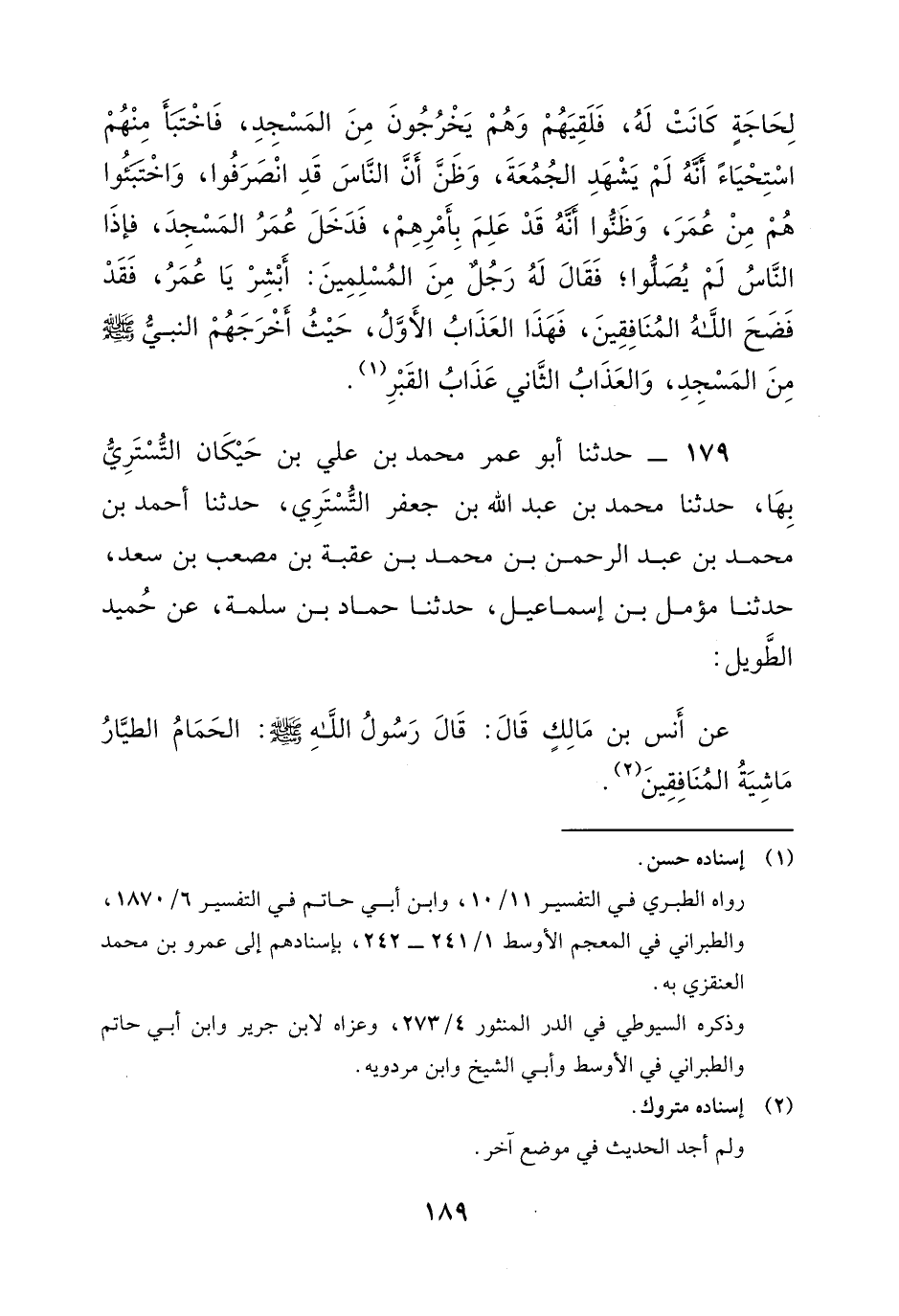 179 - حَدَّثَنَا أَبُو عُمَرَ مُحَمَّدُ بْنُ عَلِيِّ بْنِ حَيْكَانَ التُّسْتَرِيُّ بِهَا، حَدَّثَنَا مُحَمَّدُ بْنُ عَبْدِ اللَّهِ بْنِ جَعْفَرٍ التُّسْتَرِيُّ، حَدَّثَنَا أَحْمَدُ بْنُ مُحَمَّدِ بْنِ عَبْدِ الرَّحْمَنِ بْنِ مُحَمَّدِ بْنِ عُقْبَةَ بْنِ مُصْعَبِ بْنِ سَعْدٍ، حَدَّثَنَا مُؤَمَّلُ بْنُ إِسْمَاعِيلَ، حَدَّثَنَا حَمَّادُ بْنُ سَلَمَةَ، عَنْ حُمَيْدٍ الطَّوِيلِ، عَنْ أَنَسِ بْنِ مَالِكٍ، قَالَ: قَالَ رَسُولُ اللَّهِ صَلَّى اللَّهُ عَلَيْهِ وَسَلَّمَ: الْحَمَامُ الطَّيَّارُ مَاشِيَةُ الْمُنَافِقِينَ "