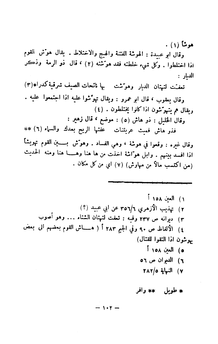 وقال غيره: وقعوا في هوشة، وهي الفساد. وهوّش بين القوم تهويشًا إذا أفسد بينهم. وإبل هوّاشة أخذت من ههنا وههنا ومنه الحديث "من اكتسب مالًا من مهاوش" أي من كل مكان.