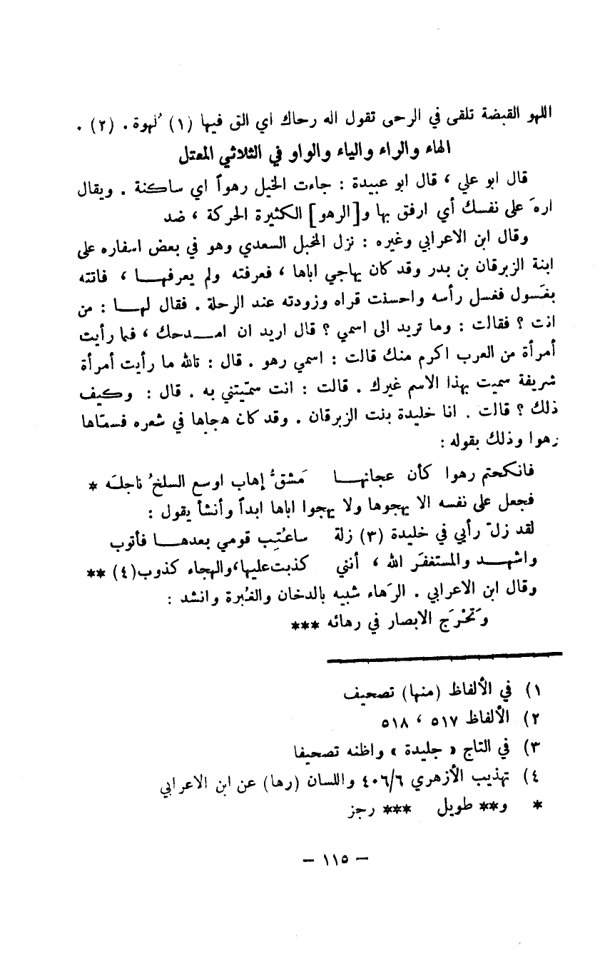 قال أبو علي، قال أبو عبيدة: جاءت الخيل رهوًا أي ساكنة. ويقال ارهَ على نفسك أي ارفق بها والرهو الكثيرة الكثيرة الحركة، ضد.