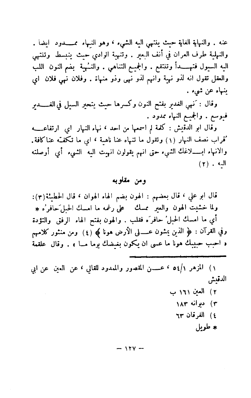 وقال أبو الدقيش: كلمة لم أسمعها من أحد، نهاء النهار أي ارتفاعه قُراب نصف النهار. وتقول ما تنهاه عنا ناهية، أي ما تكفّه عنا كافة. والإنهاء إبلاغك الشيء حتى إنهم يقولون أنهيت إليه الشيء أي أوصلته إليه.