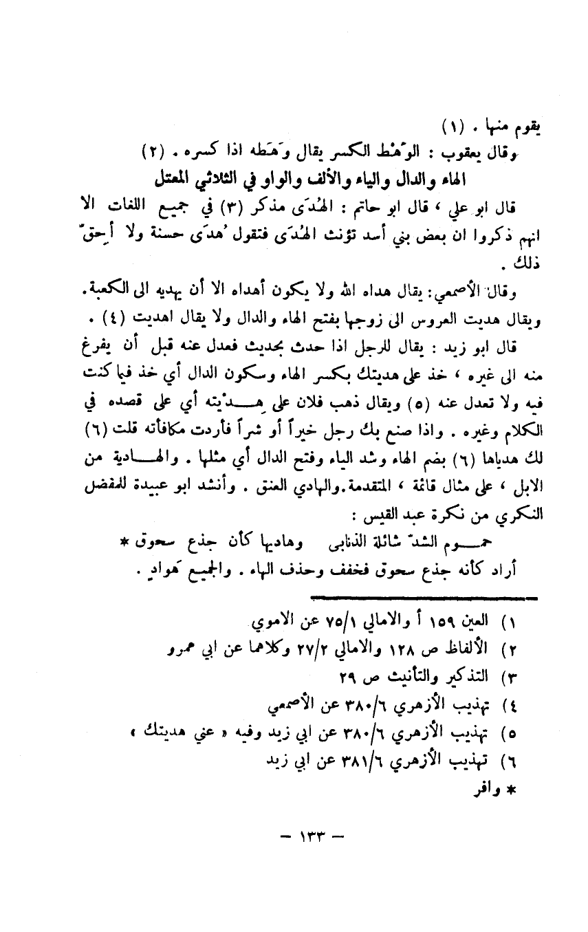 قال أبو زيد: يقال للرجل إذا حدث بحديث فعدل عنه قبل أن يفرغ منه إلى غيره، خذ على هديتك بكسر الهاء وسكون الدال أي خذ فيما كنت فيه ولا تعدل عنه. ويقال ذهب فلان على هِدْيته أي على قصده في الكلام وغيره. وإذا صنع بك رجل خيرًا أو شرًّا فأردت مكافأته قلت لك هدياها بضم الهاء وشد الياء وفتح الدال أي مثلها. والهادية من الإبل، على مثال قائمة، المتقدمة. والهادي العنق. وأنشد أبو عبيدة للمفضل النكري من نكرة عبد القيس: