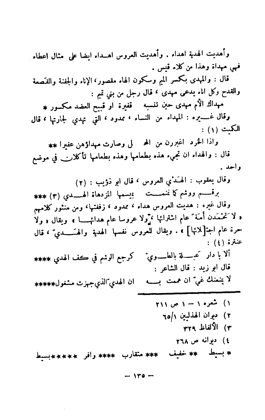 وقال غيره: هديت العروس هداء، ممدود، زففتها، ومن منثور كلامهم "لا تَحْمَدن أَمَةً عام اشترائها، ولا عروسا عام هدائها" ويقال "ولا حرة عام اجتلائها". ويقال للعروس نفسها الهدية والهَديّ، قال عنترة: