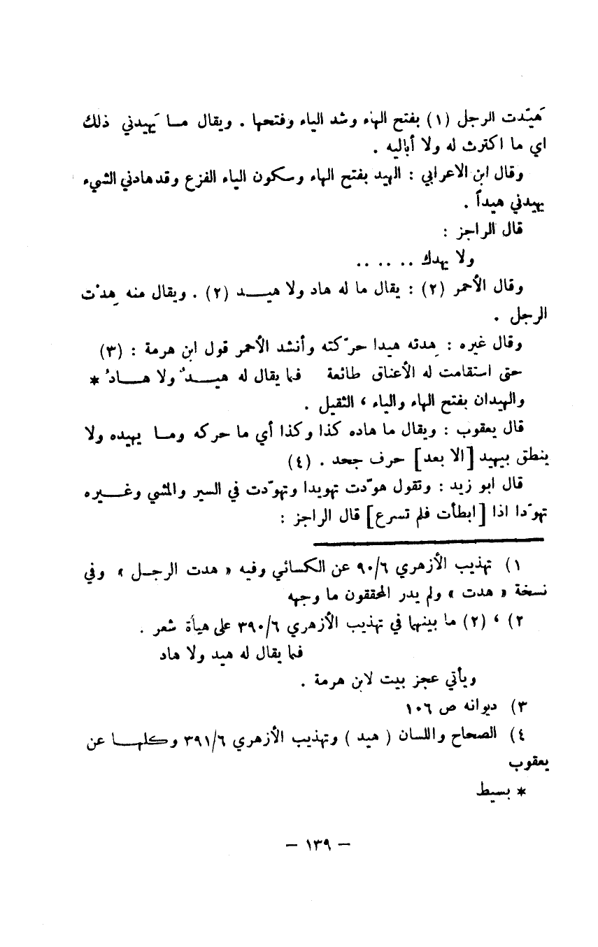 وقال ابن الأعرابي: الهيد بفتح الهاء وسكون الياء الفزع وقد هادني الشيء يهيدني هيدًا.