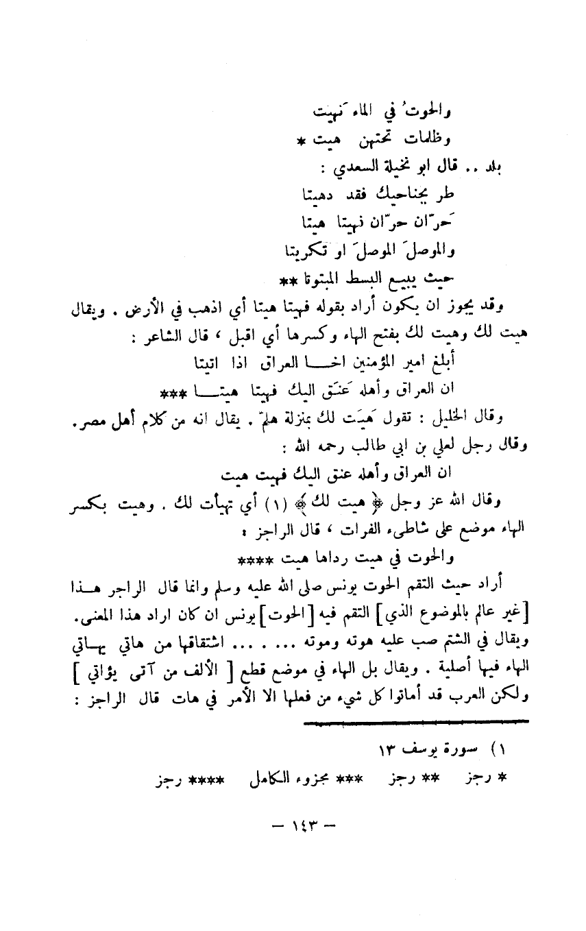 أراد حيث التقم الحوت يونس صلى الله عليه وسلم وإنما قال الراجز هذا غير عالم بالموضوع الذي التقم فيه الحوت يونس إن كان أراد هذا المعنى. ويقال في الشتم صب عليه هوته وموته ....... اشتقاقها من هاتي يهاتي الهاء فيها أصلية. ويقال بل الهاء في موضع قطع الألف من آتى يؤاتي ولكن العرب قد أماتوا كل شيء من فعلها إلا الأمر في هات قال الراجز: